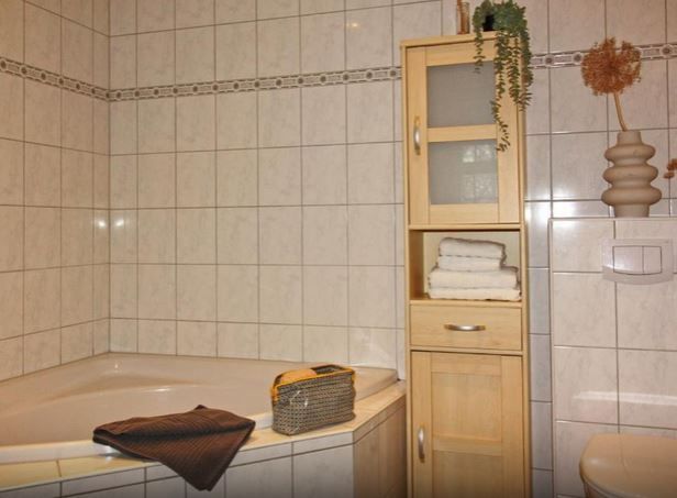 Das Bad ist mit Dusche, Eckbadewanne, WC und Waschtisch ausgestattet.
