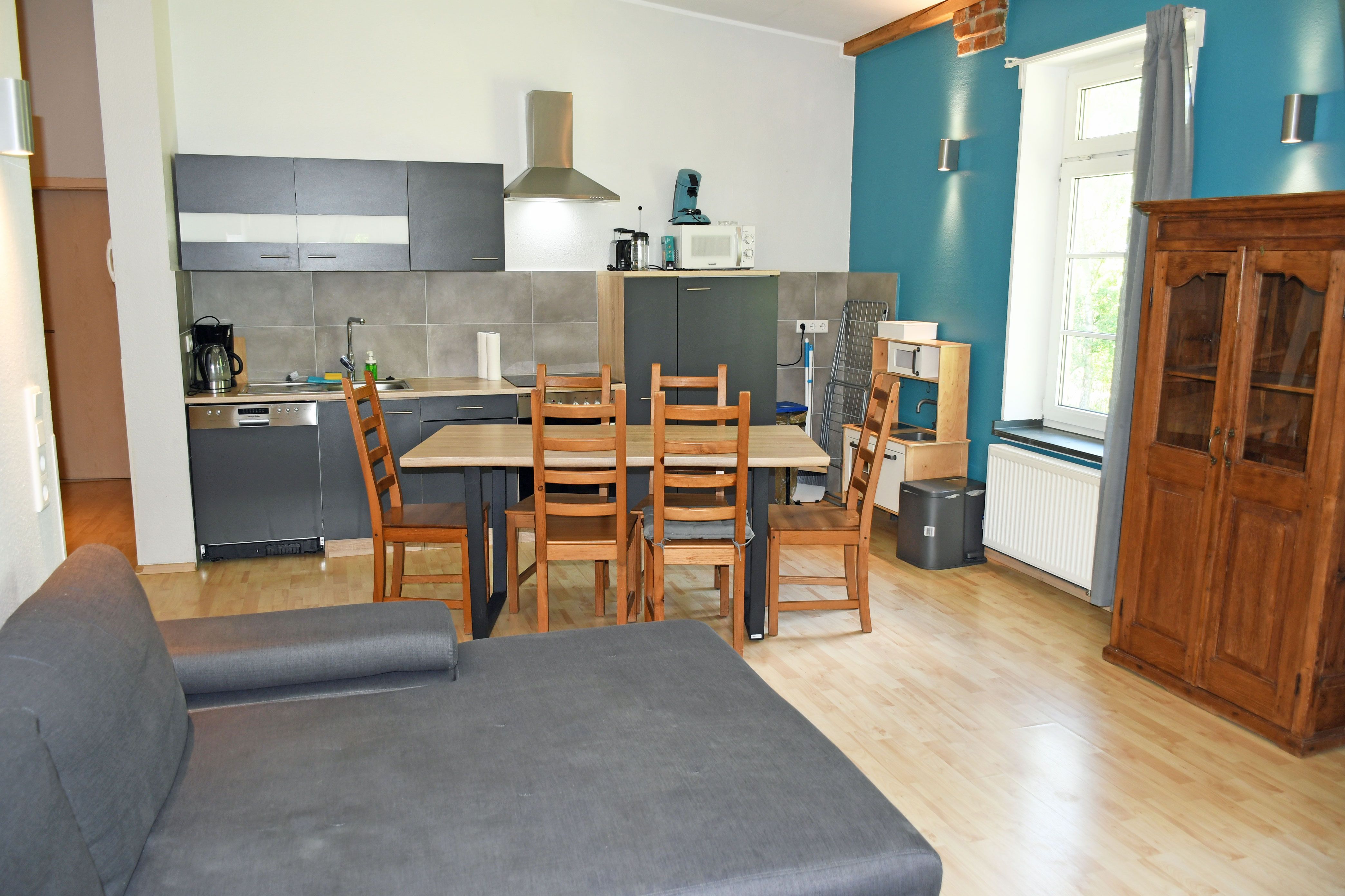 Die Küchenausstattung beinhaltet u.a.: Mikrowelle, einen großen Herd, Kaffeemaschine, Wasserkocher. Kostenfrei können ein Raclette, ein Waffeleisen und einen Pürierstab ausgeliehen werden.