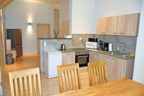Die Küchenausstattung beinhaltet u.a.: Mikrowelle, einen großen Herd, Kaffeemaschine, Wasserkocher. Kostenfrei können ein Raclette, ein Waffeleisen und einen Pürierstab ausgeliehen werden.