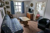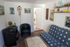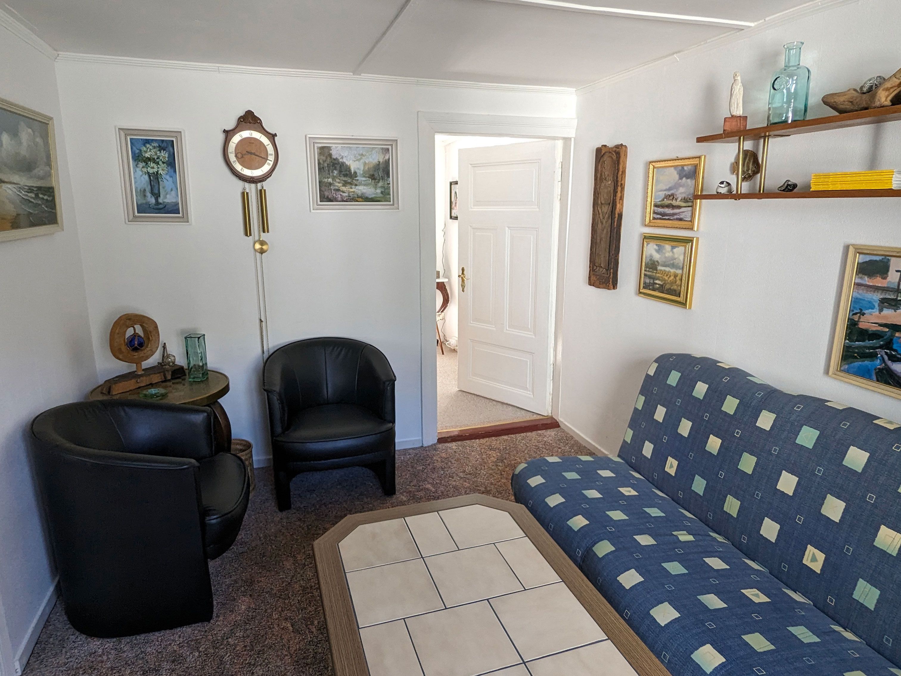• Über eine Treppe erreichen Sie das Wohnzimmer mit Couchgarnitur, Tisch, 2 Schalensessel und Flachbild-TV.