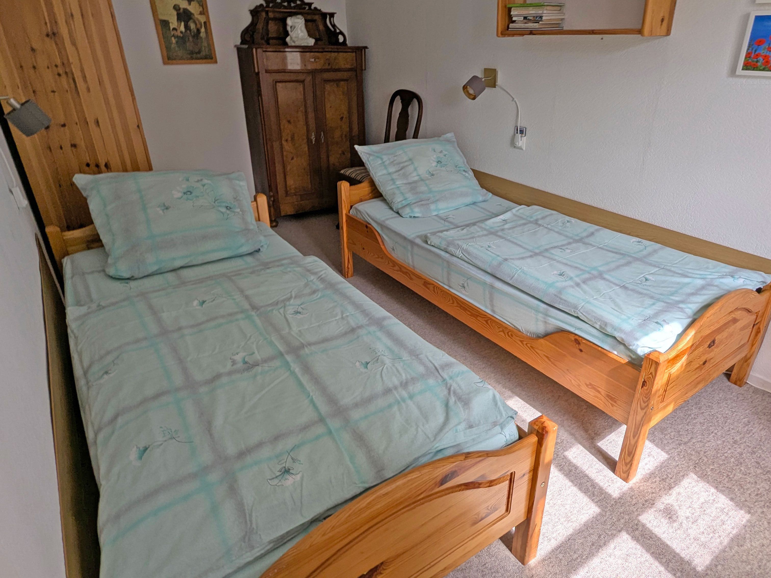 • Neben dem Wohnzimmer befindet sich das Schlafzimmer mit 2 Einzelbetten, Leselampen und Kleiderschrank.