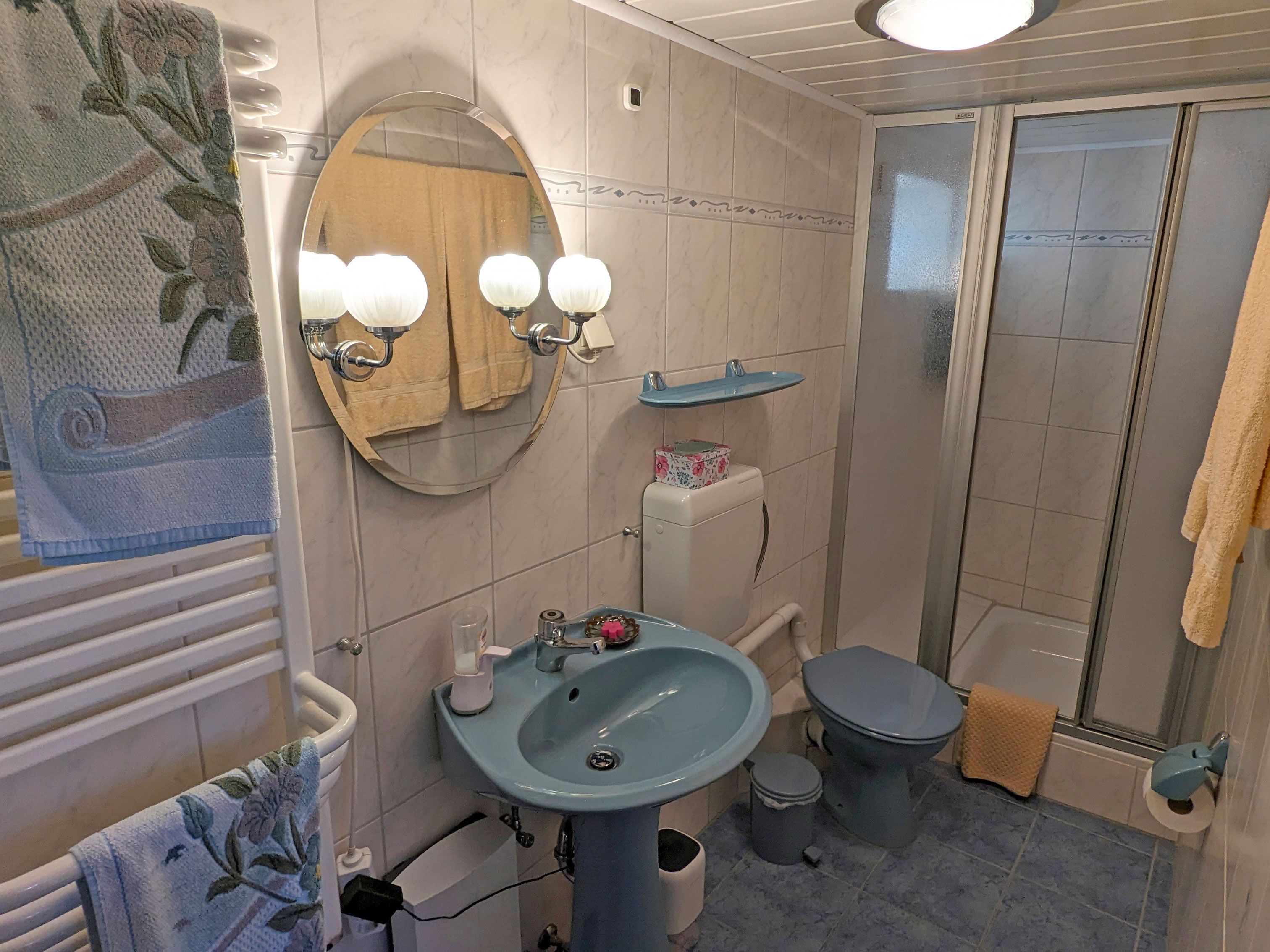 • Im Gartengeschoss befindet sich das Badezimmer mit Dusche, Waschtisch und Toilette.