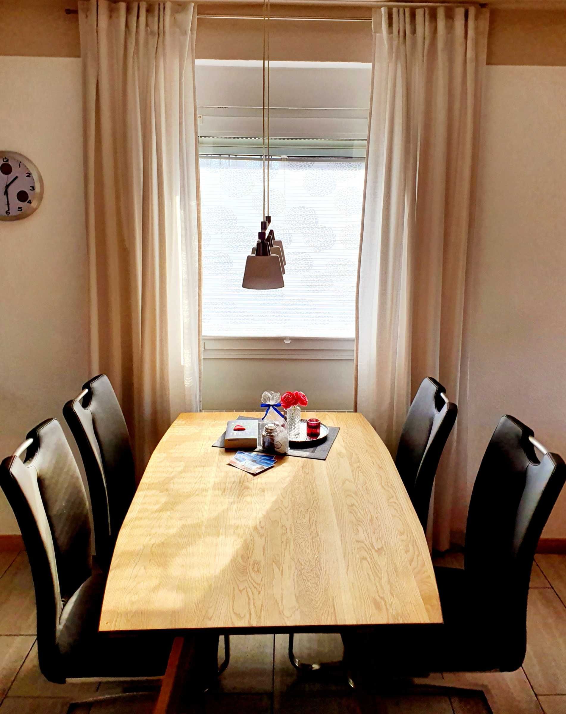 Dreas Huus ist geeignet für 2-6 Personen und mit fast 80 qm ausreichend groß für einen entspannten Ferienaufenthalt. Im Erdgeschoss empfängt sie ein Wohn- und Esszimmer mit integrierter Küche. Von hier aus haben sie den direkten Zugang zur Terrasse. Auch ein kleines WC findet sich im Eingangsbereich. Eine ausreichend große Treppe führt sie in die zwei Schlafräume und ein Badezimmer mit Dusche, Waschmaschine und Wäschetrockner. Ein fünfter Schlafplatz findet sich auf einer bequemen Schlafcouch im Wohnzimmer.