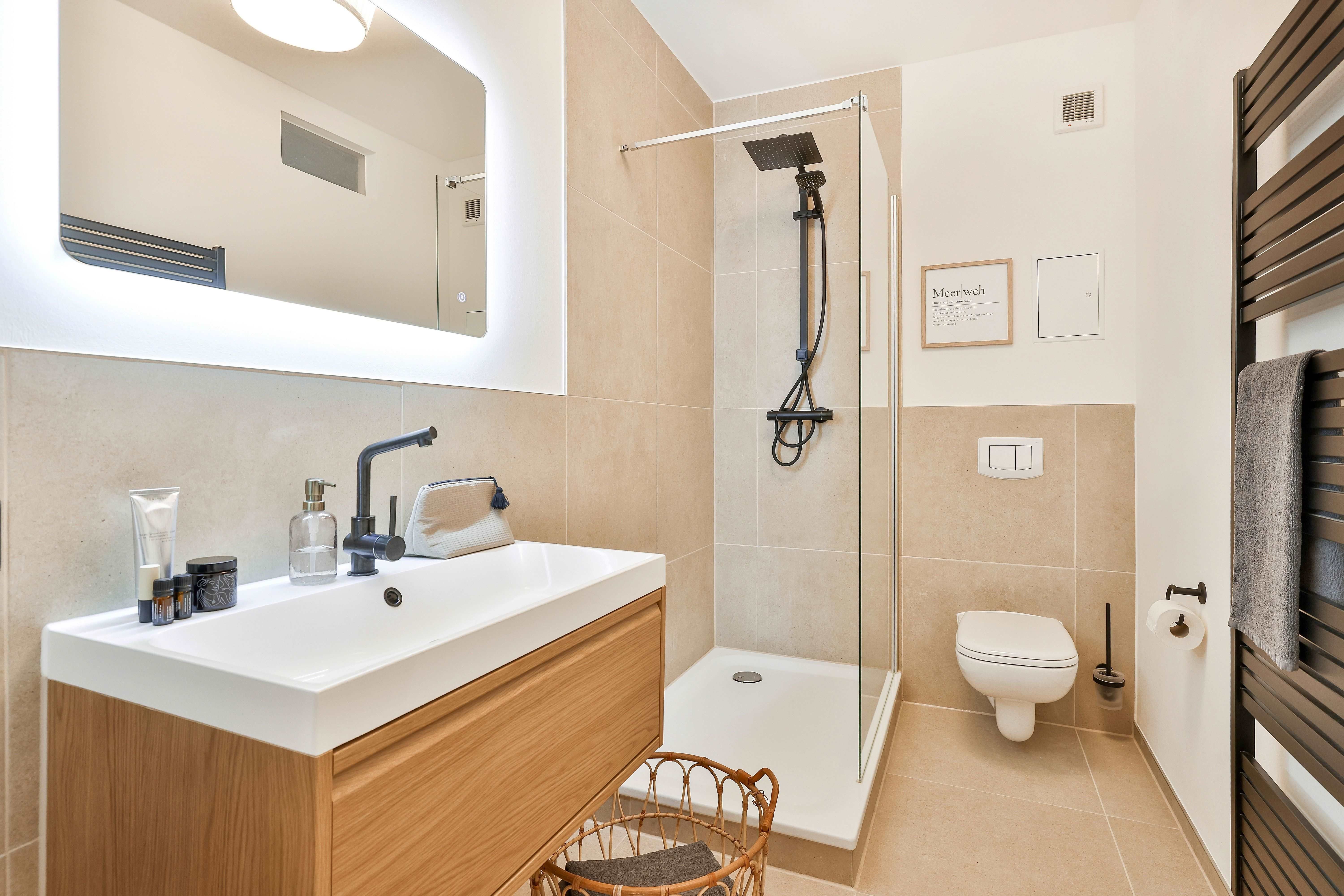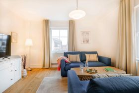 Die Wohnung liegt im 1.OG eines komplett sanierten Apartmenthauses und besteht aus einem großen Wohnbereich, Küche und Essbereich, zwei Schlafräumen mit Doppelbett und einem Bad mit Dusche sowie einem Balkon.