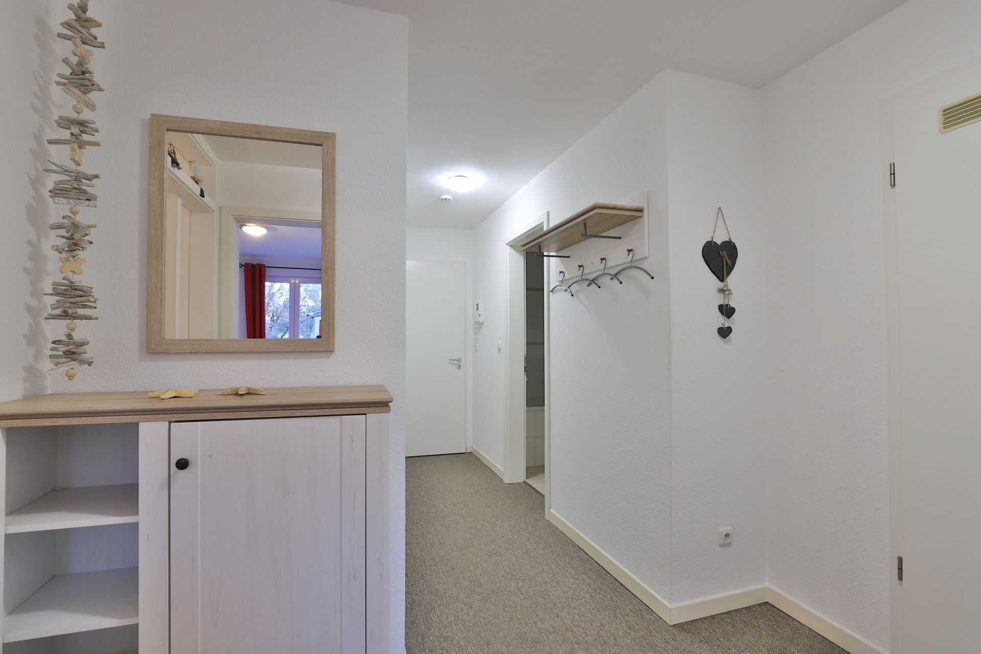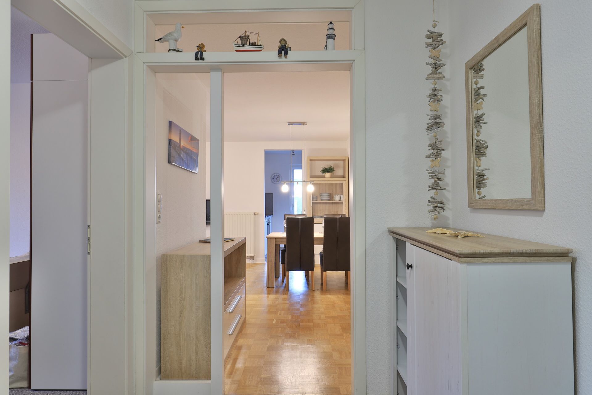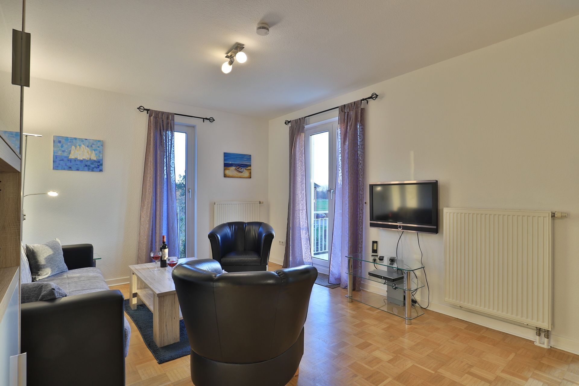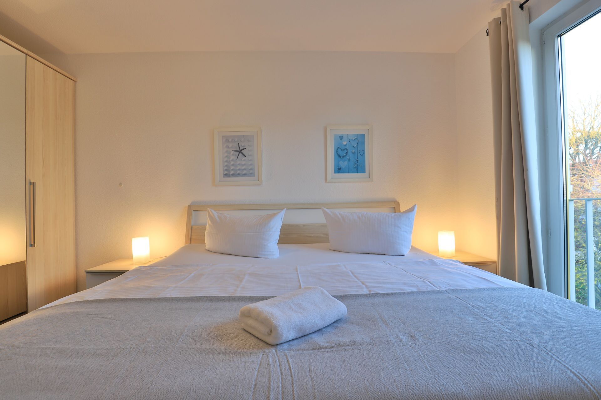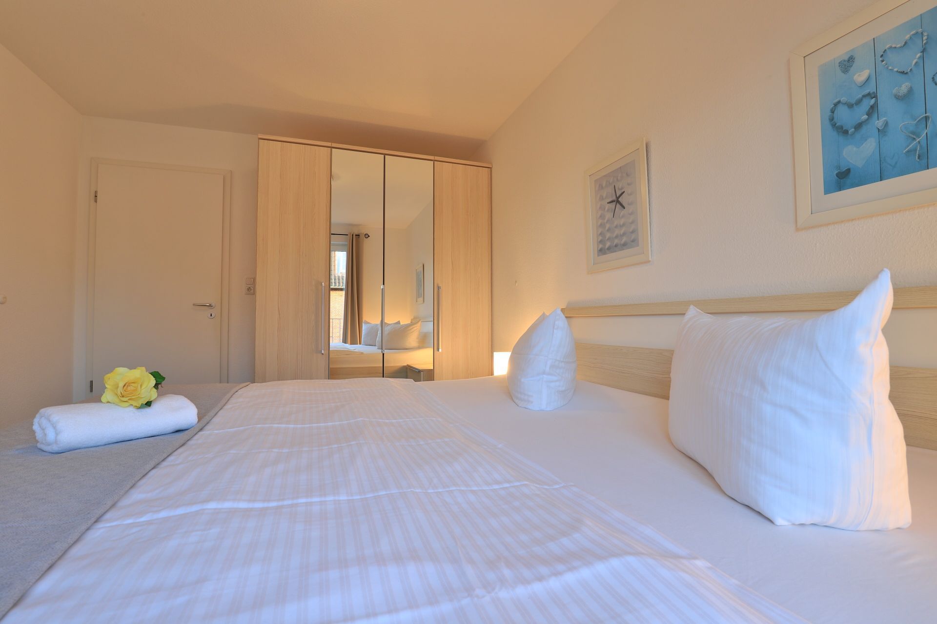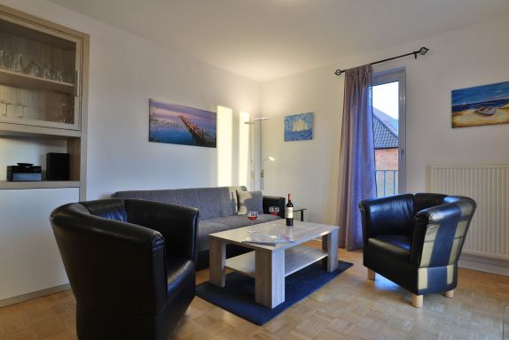 Das 3-Zimmer Appartement Seeschwalbe 8, bietet Ihnen eine Wohnfläche von ca.74qm und ist bestens geeignet für eine Belegung mit bis zu 4 Personen. Mit dem Fahrstuhl gelangen Sie bequem in das      1.Obergeschoss. Das komfortabel möblierte Wohn- und Esszimmer ist mit einer Sofagarnitur, Beistelltisch, Esstisch mit vier Sitzplätzen sowie Fernseher und Musikanlage ausgestattet. WLAN kann gebührenfrei genutzt werden. Vom Wohnbereich aus gelangen Sie auf den saisonal möblierten Balkon. Die voll ausgestattete Küche ist separat und bestens geeignet, um sich eigenständig zu versorgen.  Ceranfeldherd, Backofen, Mikrowelle, Kühlschrank mit integr. Gefrierfach, Kaffeemaschine, Wasserkocher, Toaster usw. Ihre Nächte verbringen Sie in zwei separaten Schlafzimmern. Eines ist mit einem Doppelbett und Kleiderschrank möbliert. Das zweite Schlafzimmer lädt mit zwei Einzelbetten, Kleiderschrank und einem zweiten Fernseher zum Wohlfühlen ein. Die familienfreundliche Ausstattung umfasst einen Kinderhochstuhl und Kinderbett. Zugehörig ist ein modernisiertes Vollbad mit Wanne und darin integr.Duschfunkton, Waschtisch, Handtuchheizung, Föhn, WC.