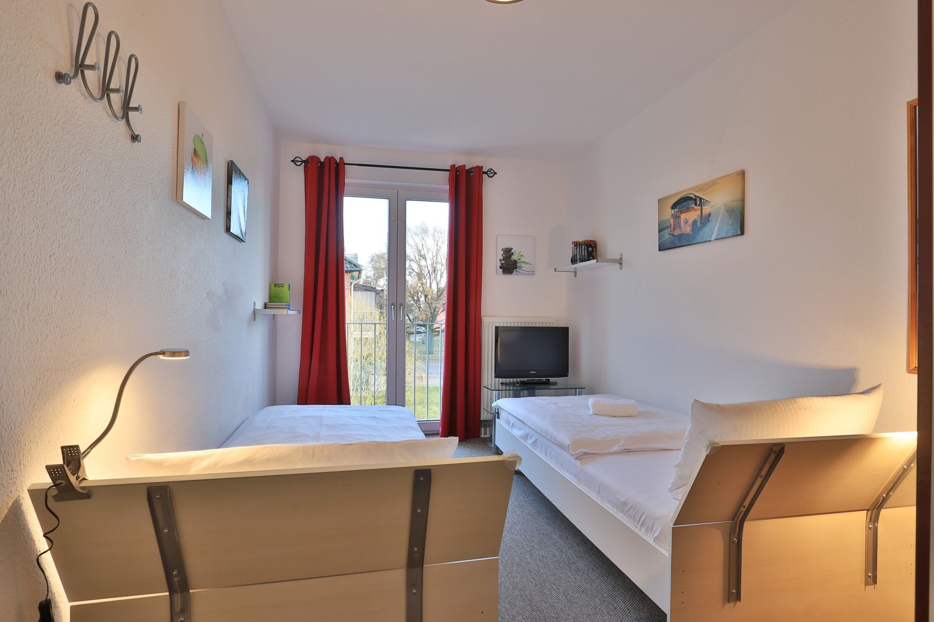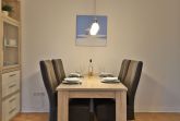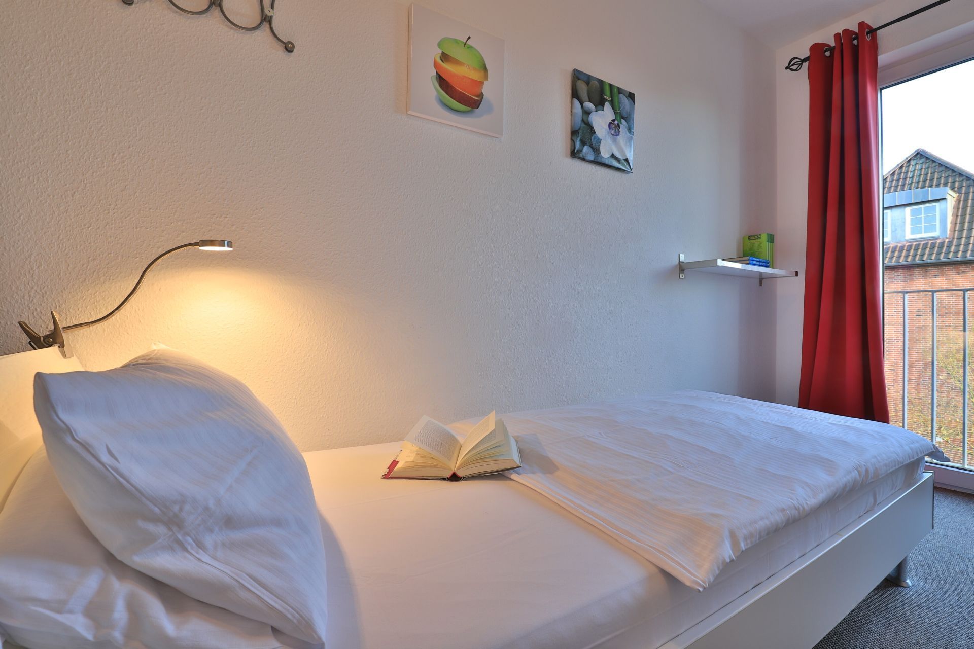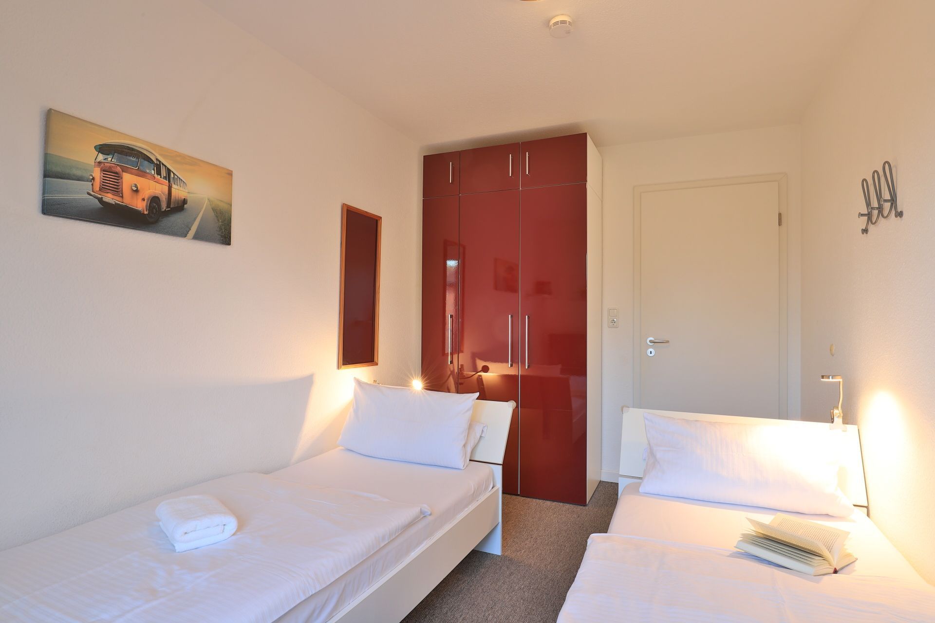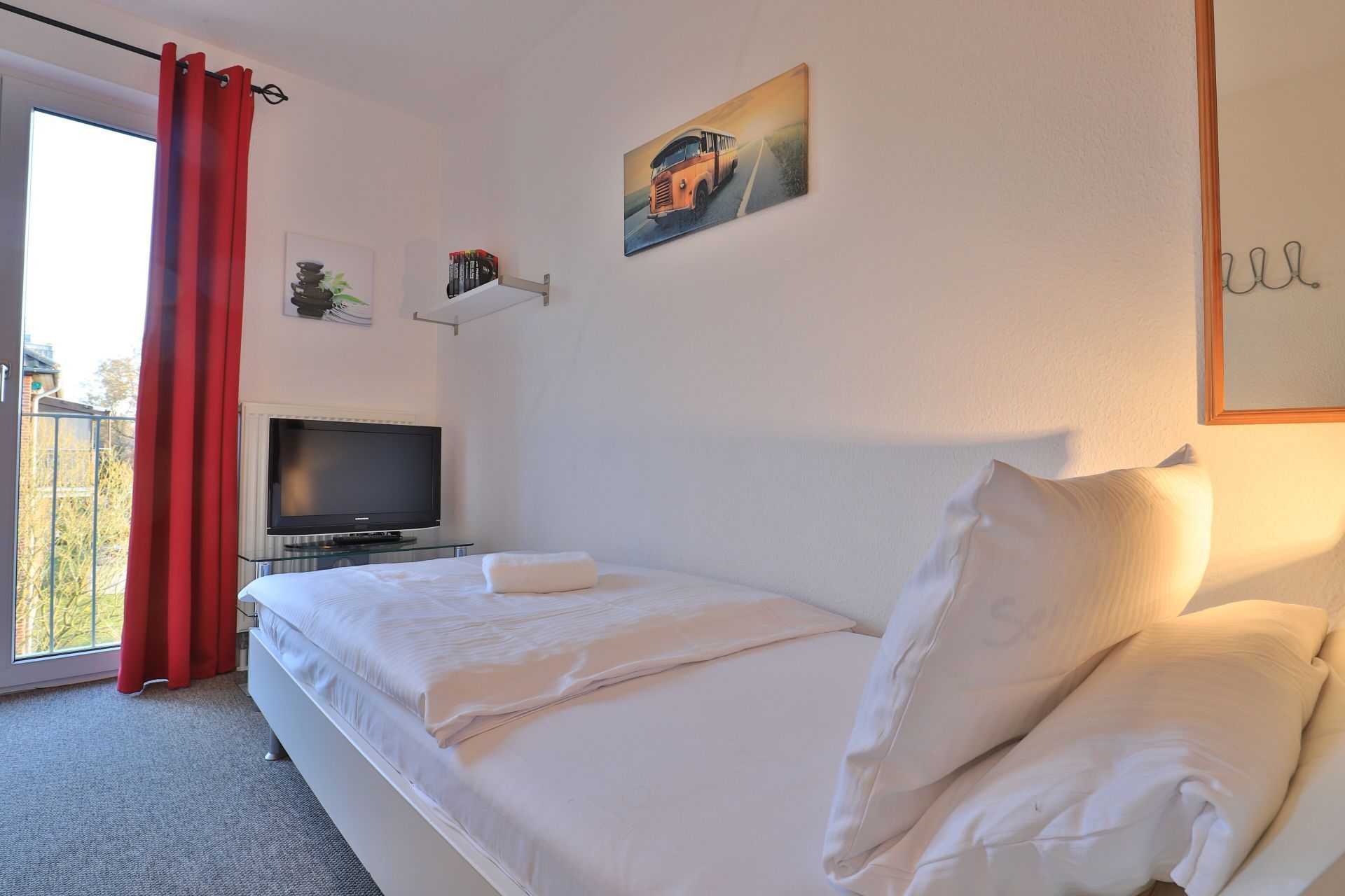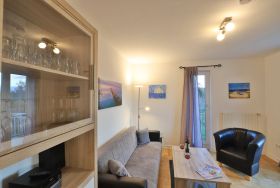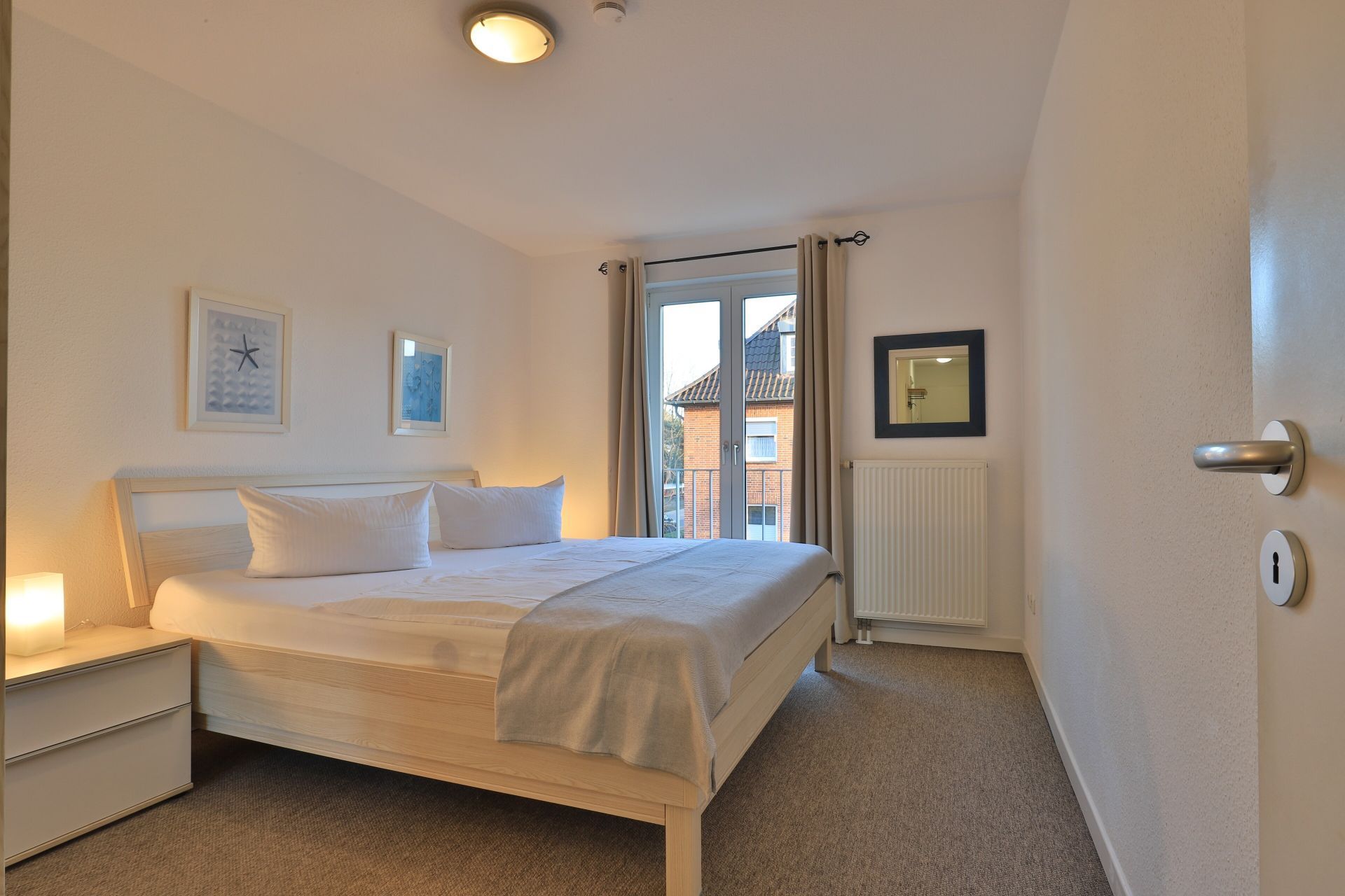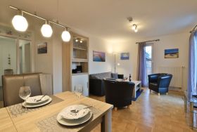 Das 3-Zimmer Appartement Seeschwalbe 8, bietet Ihnen eine Wohnfläche von ca.74qm und ist bestens geeignet für eine Belegung mit bis zu 4 Personen. Mit dem Fahrstuhl gelangen Sie bequem in das      1.Obergeschoss. Das komfortabel möblierte Wohn- und Esszimmer ist mit einer Sofagarnitur, Beistelltisch, Esstisch mit vier Sitzplätzen sowie Fernseher und Musikanlage ausgestattet. WLAN kann gebührenfrei genutzt werden. Vom Wohnbereich aus gelangen Sie auf den saisonal möblierten Balkon. Die voll ausgestattete Küche ist separat und bestens geeignet, um sich eigenständig zu versorgen.  Ceranfeldherd, Backofen, Mikrowelle, Kühlschrank mit integr. Gefrierfach, Kaffeemaschine, Wasserkocher, Toaster usw. Ihre Nächte verbringen Sie in zwei separaten Schlafzimmern. Eines ist mit einem Doppelbett und Kleiderschrank möbliert. Das zweite Schlafzimmer lädt mit zwei Einzelbetten, Kleiderschrank und einem zweiten Fernseher zum Wohlfühlen ein. Die familienfreundliche Ausstattung umfasst einen Kinderhochstuhl und Kinderbett. Zugehörig ist ein modernisiertes Vollbad mit Wanne und darin integr.Duschfunkton, Waschtisch, Handtuchheizung, Föhn, WC.