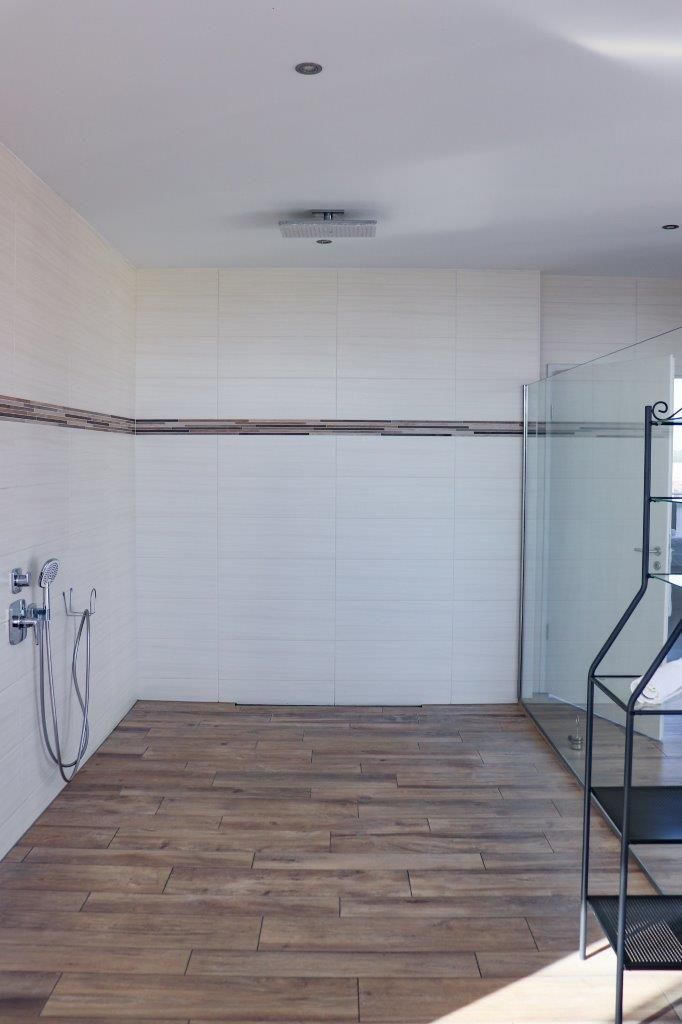 - 1 Badezimmer mit Dusche, WC, Spiegel, Waschbecken