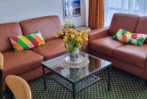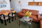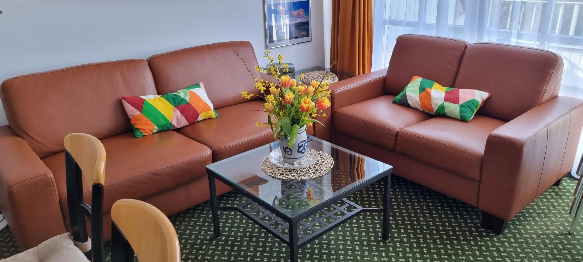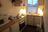 In der Küche befindet sich ein Geschirrspüler, ein Kühlschrank mit T-K Fach und ein Herd mit 4 Platten und Backofen, Mikrowelle auf Anfrage. Ein Essbereich für 4 -5 Personen schließt sich an. Die Wohnung ist im Schlaf-und Wohnbereich mit grünem Teppichboden, sandfarbig gemustert, ausgelegt.