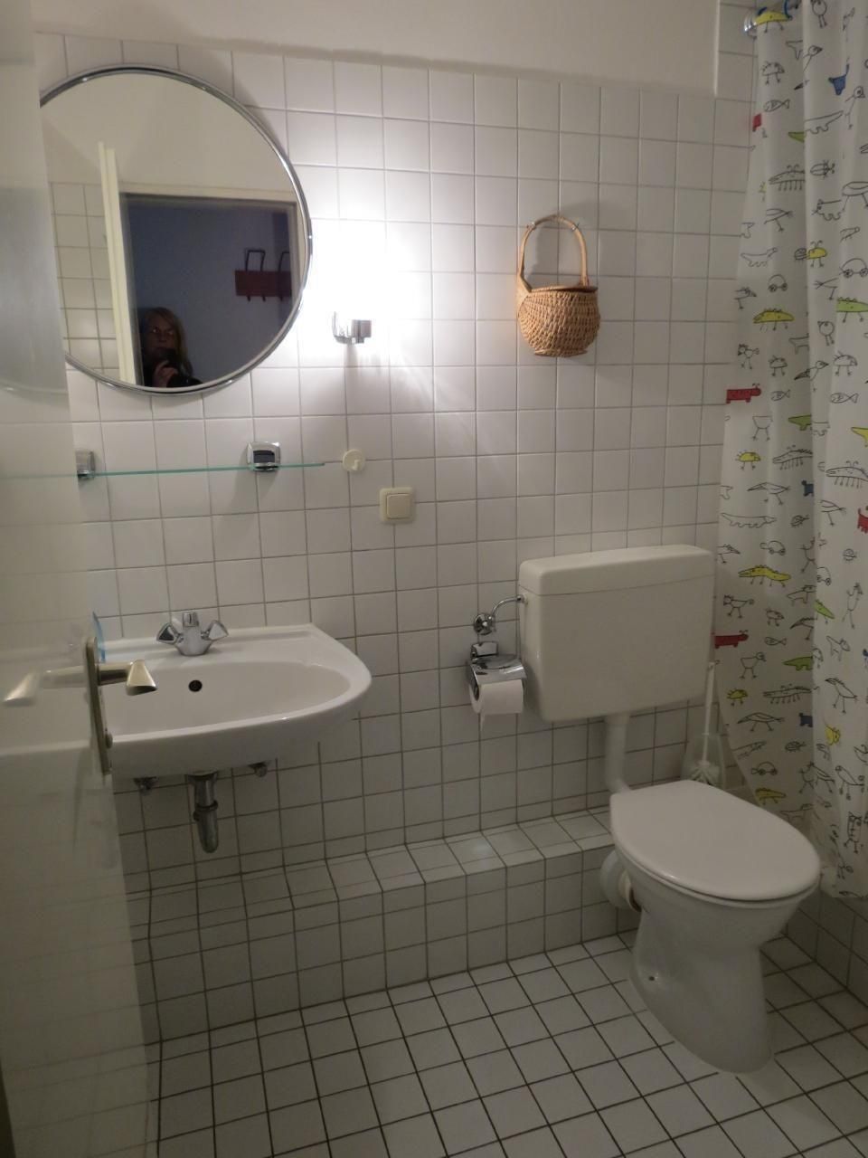In der Küche befinden sich dunkelrote Steinzeugfliesen, das Bad ist weiß gefliest.