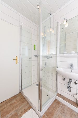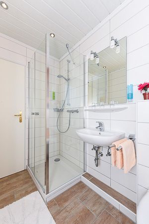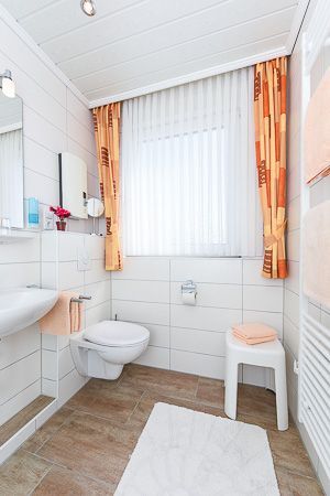 Badezimmer mit Dusche, Waschtisch und WC