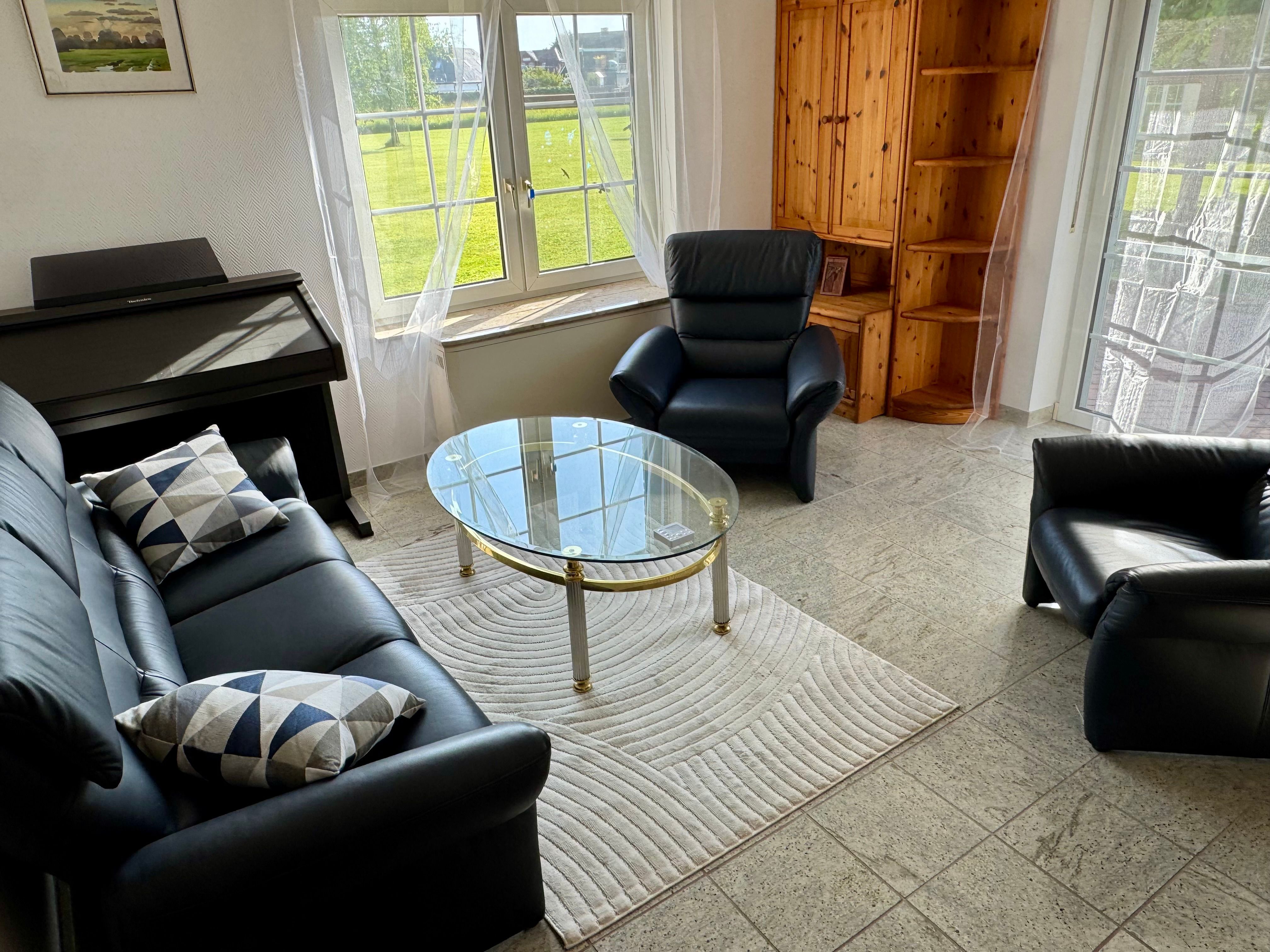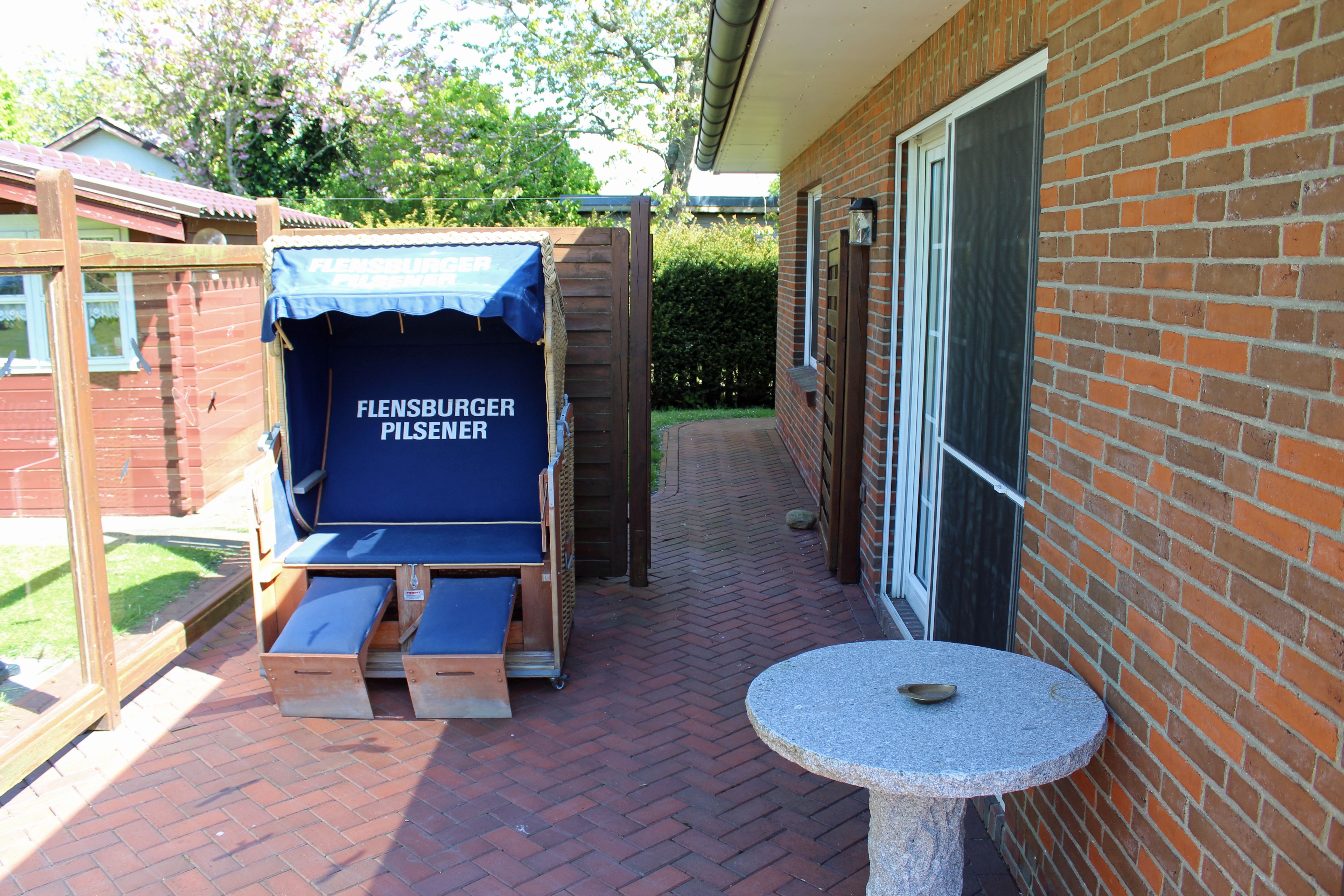 Im Erdgeschoß des Hauses befindet sich ein Schlafzimmer mit Doppelbett (180x200cm) mit großem Kleiderschrank, das schöne Wohnzimmer mit genug Platz für alle Bewohner des Hauses und Zugang zum Garten mit Sonnenterrasse, inkl. Strandkorb.
