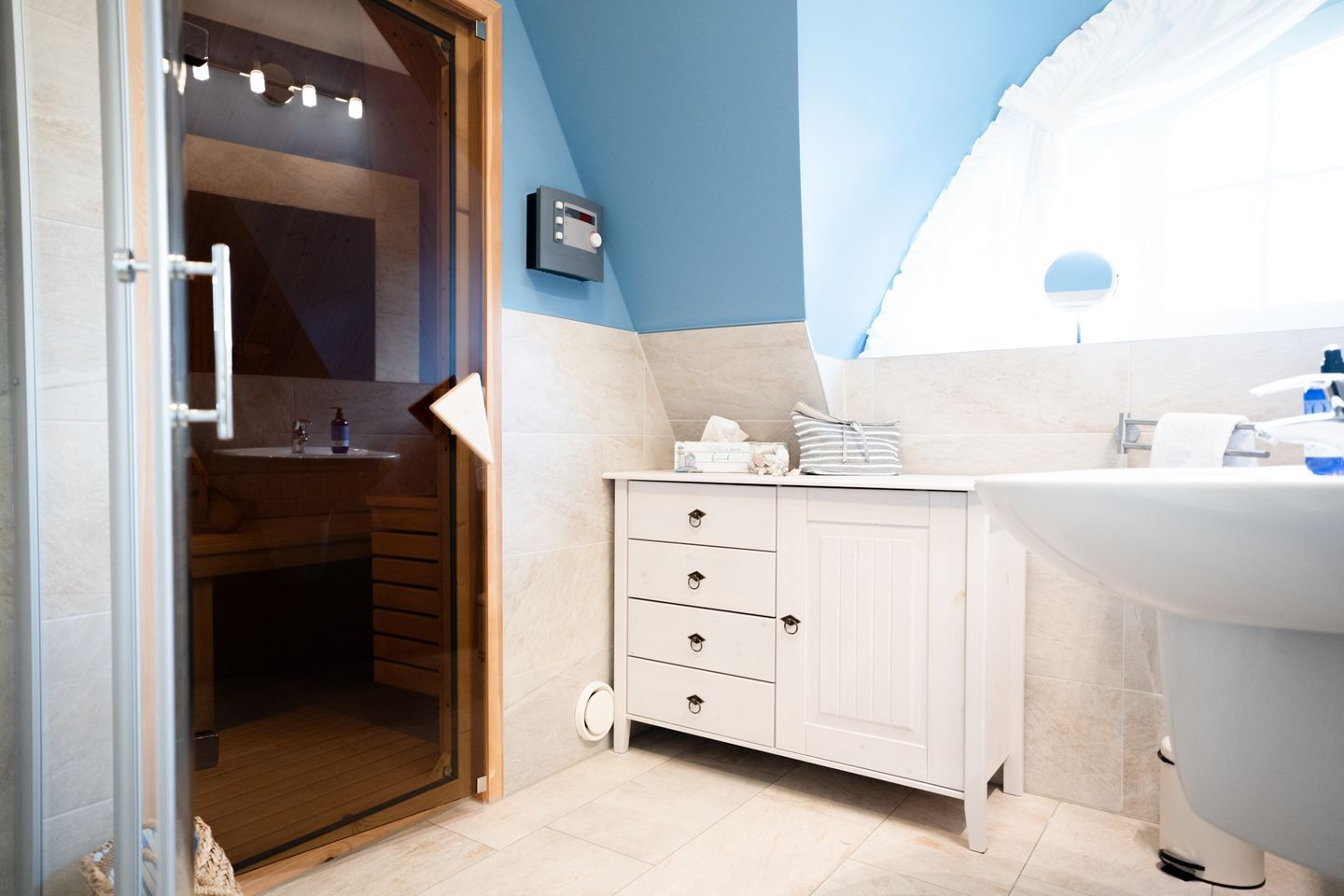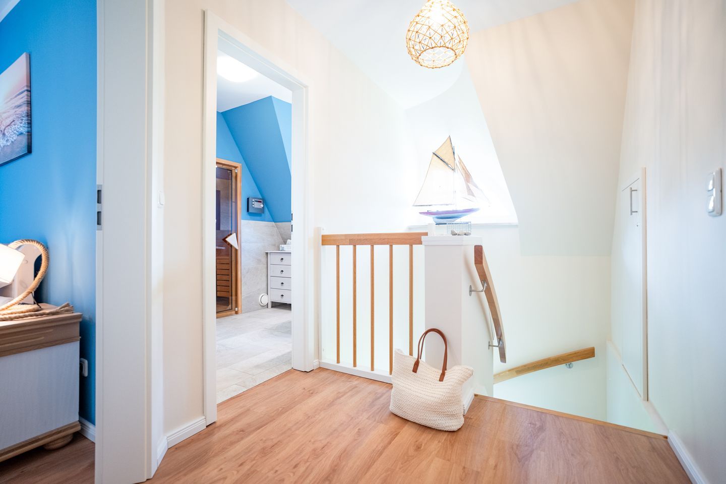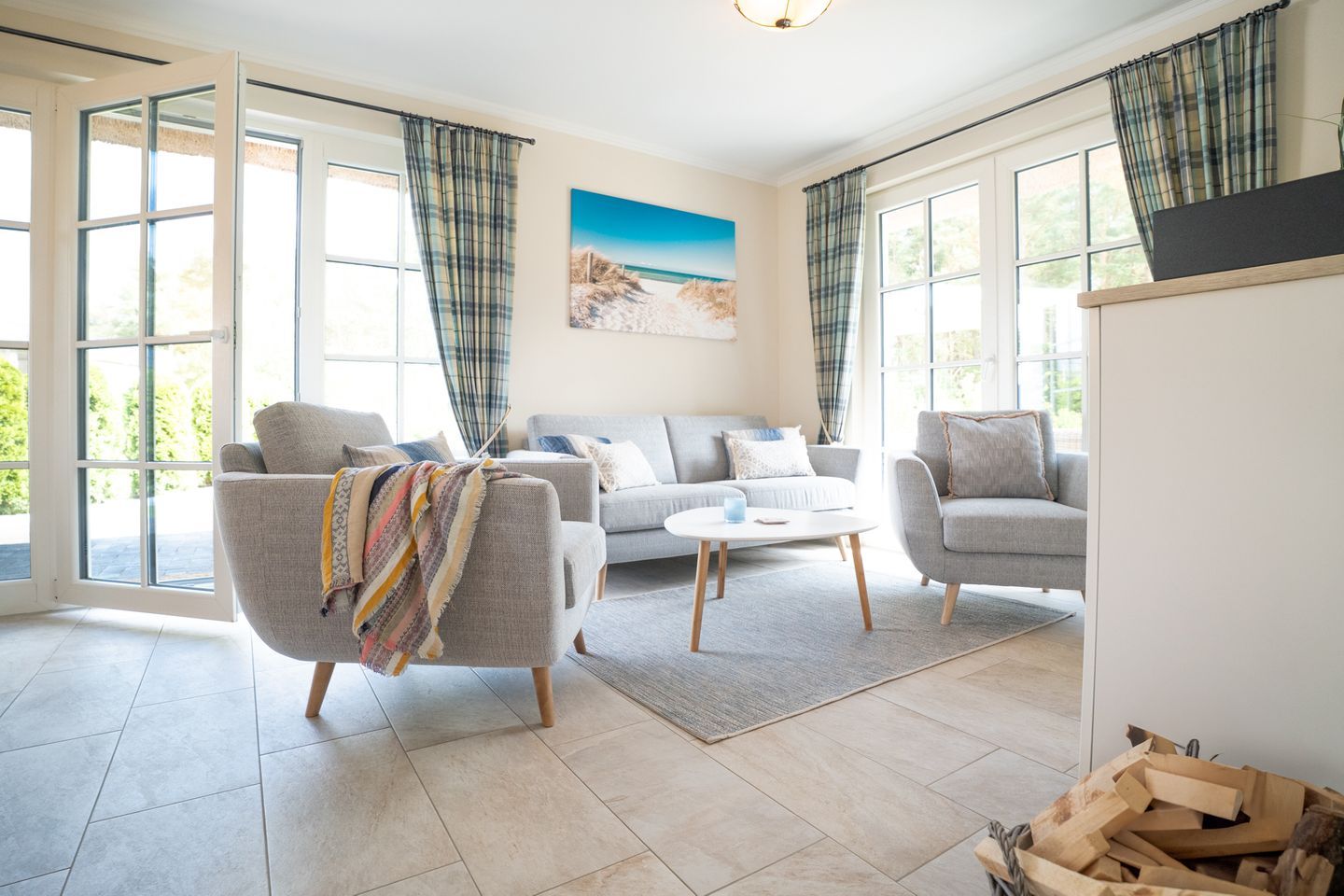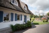 Dieses wunderschöne Ferienhaus mit traditionellem Reetdach, Fensterläden, ortstypischer Feldsteineinfriedung und großem, eingezäuntem Grundstück liegt in einer neuen Ferienhausanlage. Es bietet großzügig Platz für sechs Feriengäste (drei Schlafzimmer mit Doppelbett, davon eins im EG) und verfügt über zwei hochwertige Bäder und ein Gäste-WC, davon ein Bad im Erdgeschoss mit Dusche, ein Bad im Obergeschoss mit Dusche und Sauna.