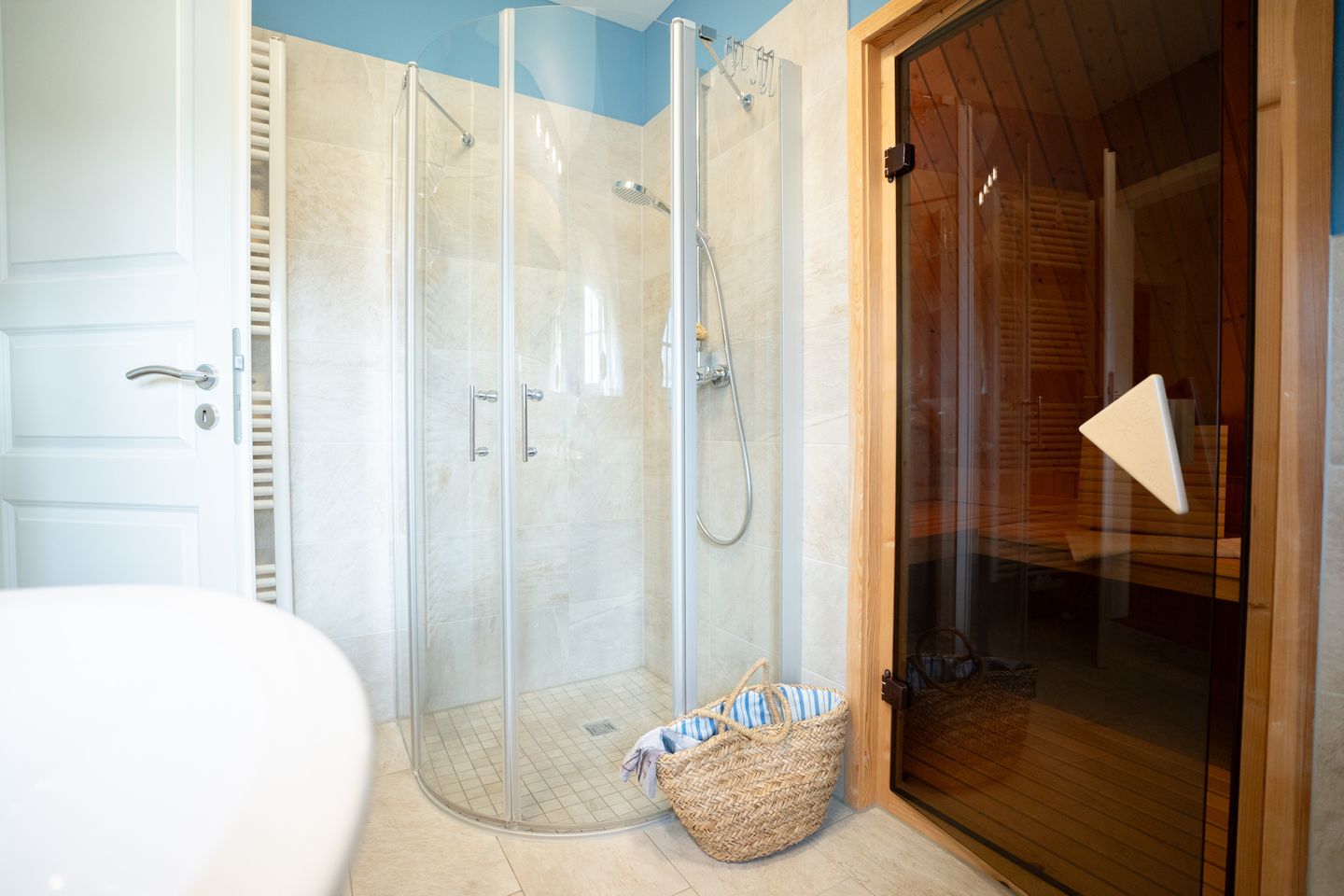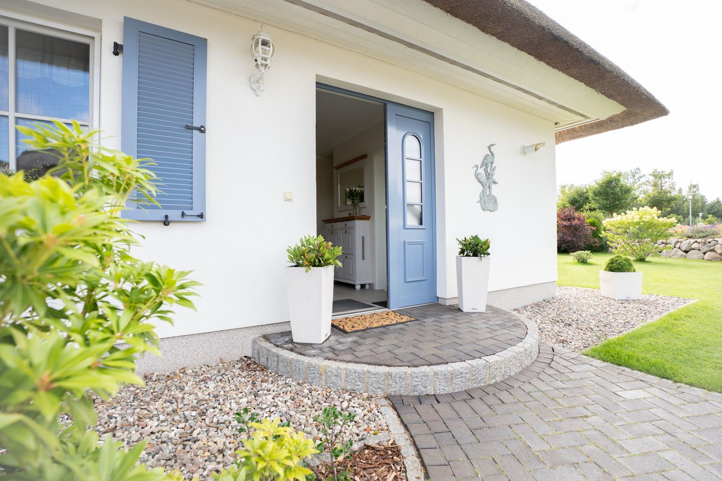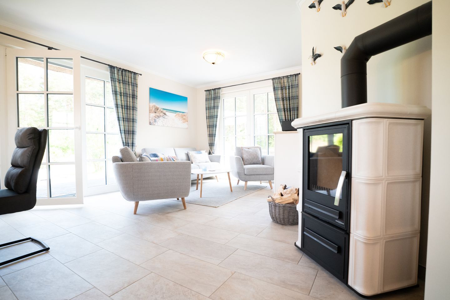 Dieses wunderschöne Ferienhaus mit traditionellem Reetdach, Fensterläden, ortstypischer Feldsteineinfriedung und großem, eingezäuntem Grundstück liegt in einer neuen Ferienhausanlage. Es bietet großzügig Platz für sechs Feriengäste (drei Schlafzimmer mit Doppelbett, davon eins im EG) und verfügt über zwei hochwertige Bäder und ein Gäste-WC, davon ein Bad im Erdgeschoss mit Dusche, ein Bad im Obergeschoss mit Dusche und Sauna.
