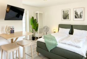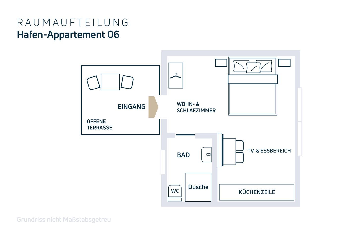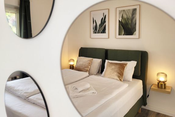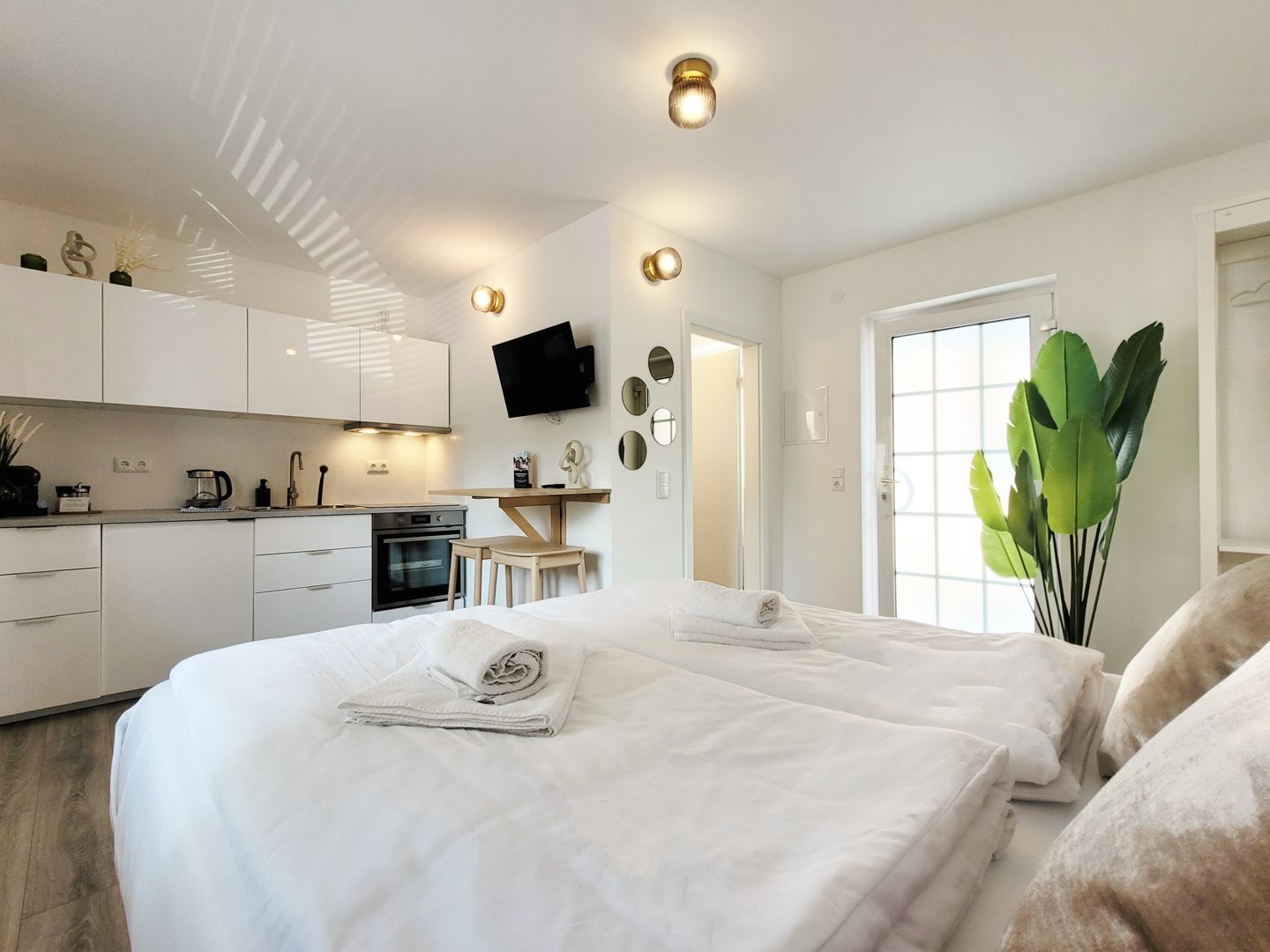 Dieses stilvoll gestaltete Apartment für zwei Personen bietet eine frische, einladende Atmosphäre und lädt dich ein, das Hafenleben hautnah zu erleben. Das helle Apartment verfügt über ein großzügiges und elegantes Boxspringbett, das für erholsame Nächte sorgt. Die geschmackvolle Einrichtung vereint moderne Elemente mit einem Hauch maritimer Romantik und schafft damit eine besonders gemütliche und einladende Stimmung.