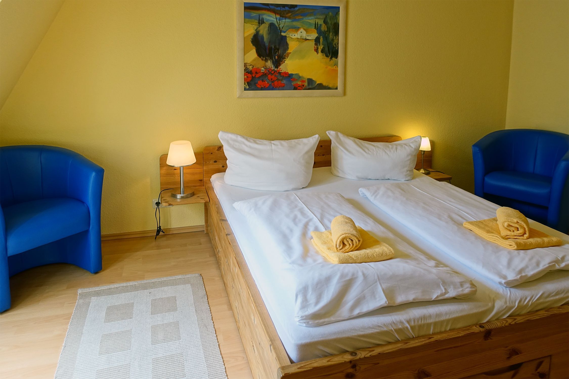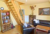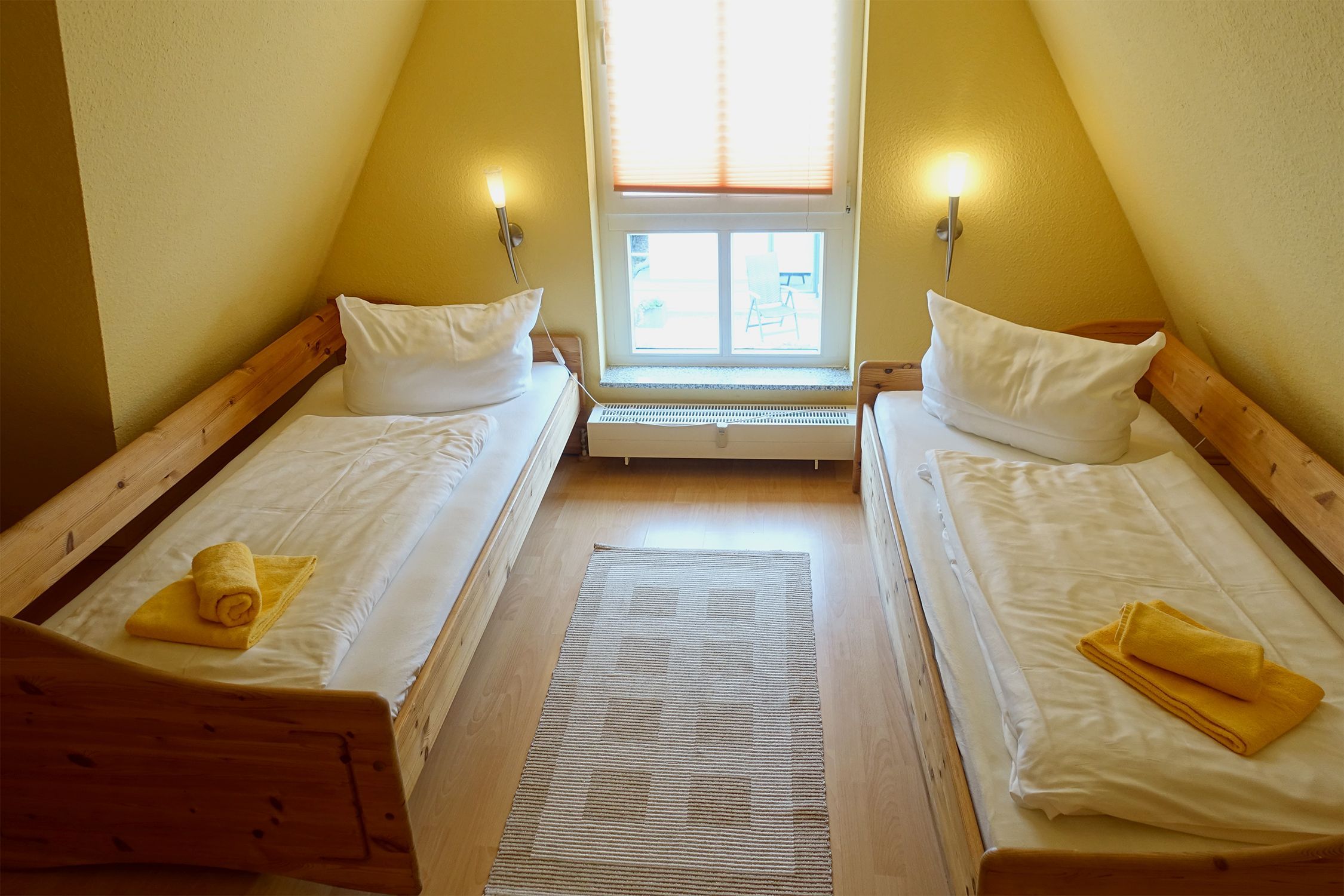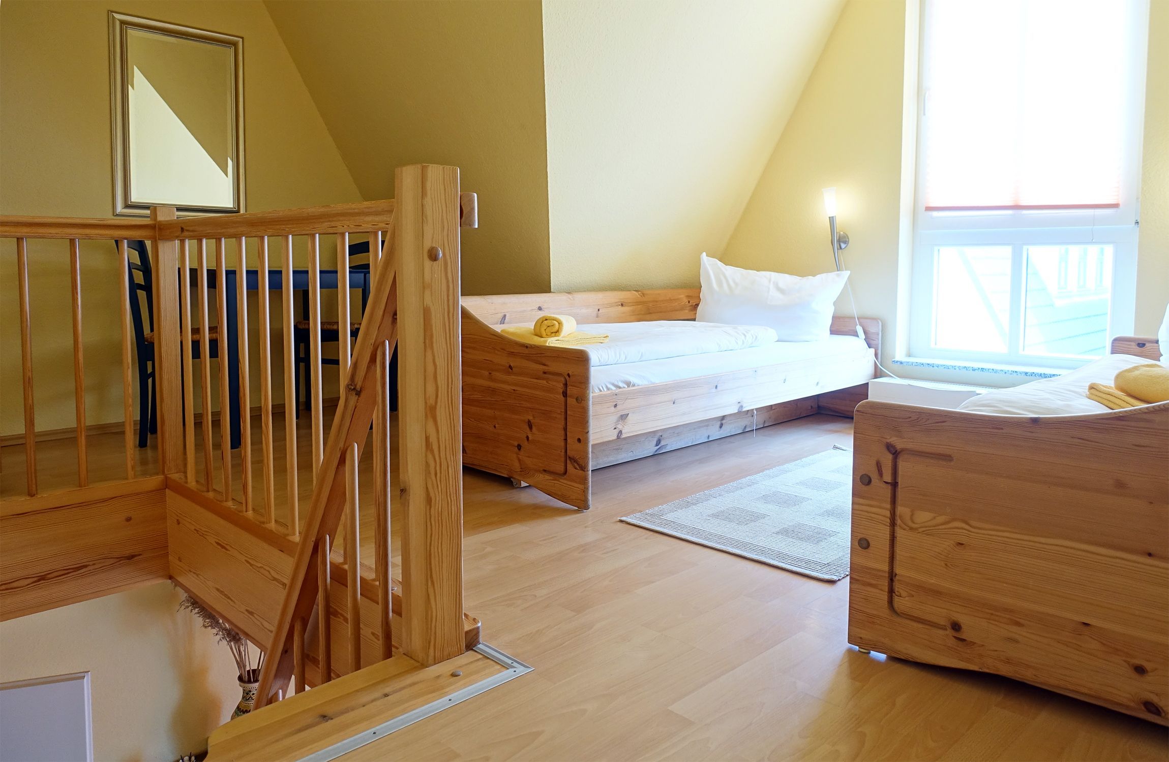 Eine Raumspartreppe im Wohnbereich führt zur offenen Galerie im Obergeschoss, wo sich zwei Einzelbetten sowie ein kleiner Tisch mit zwei Stühlen befinden. Ein separates Schlafzimmer mit Doppelbett, in dem ausreichend Platz für ein Babybett ist, befindet sich von der Galerie aus zugänglich.