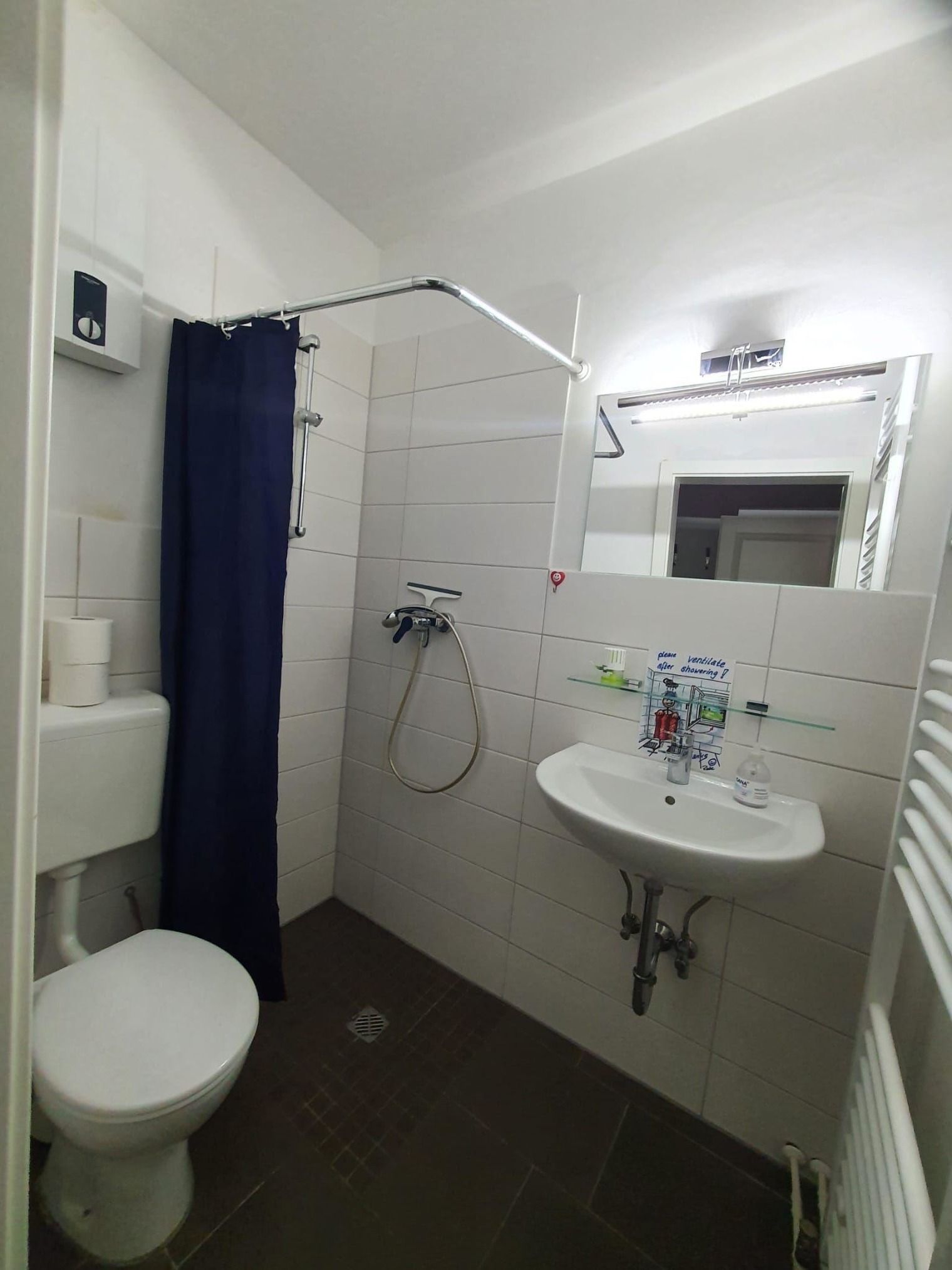 Das Badezimmer ist mit einer Dusche ausgestattet.