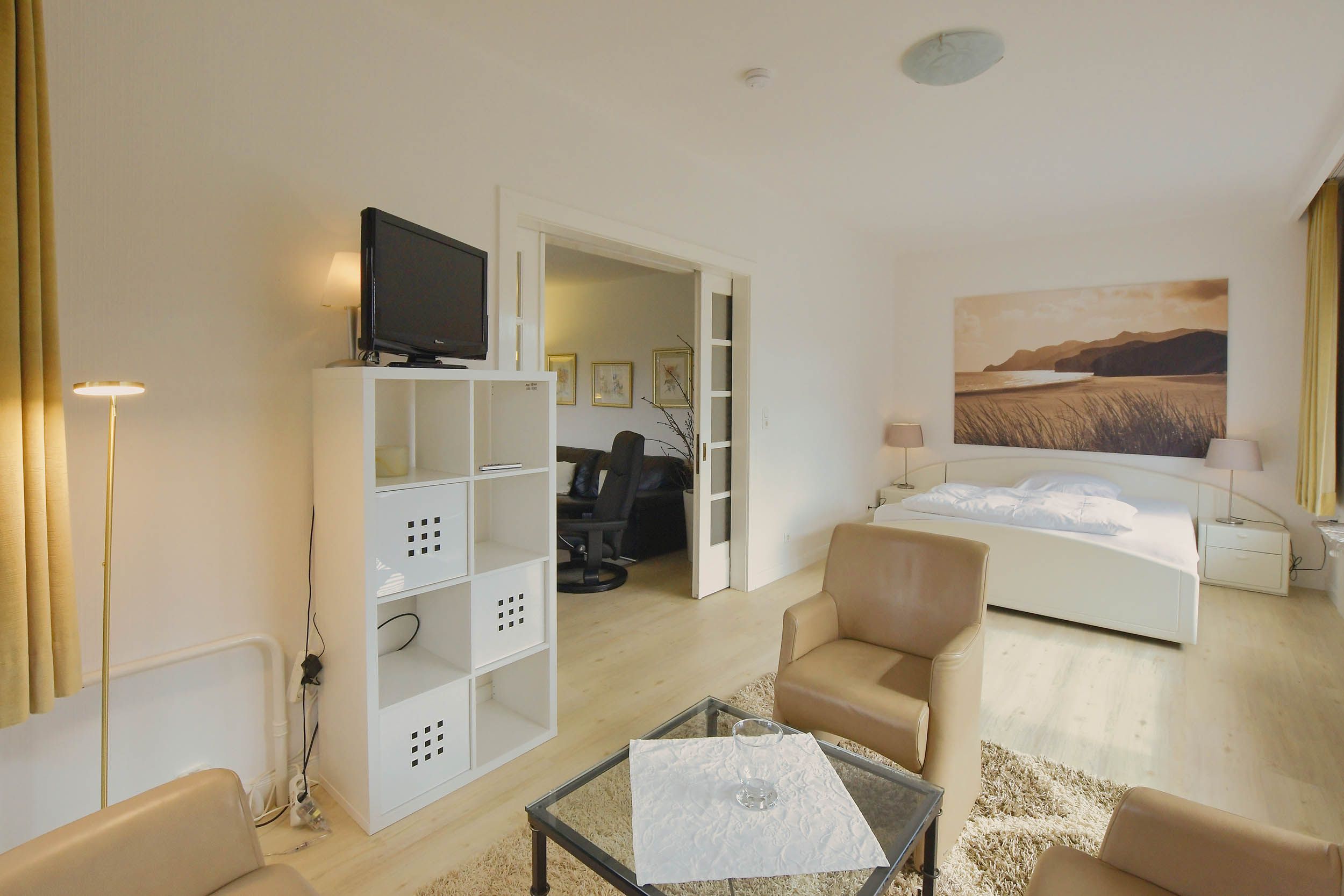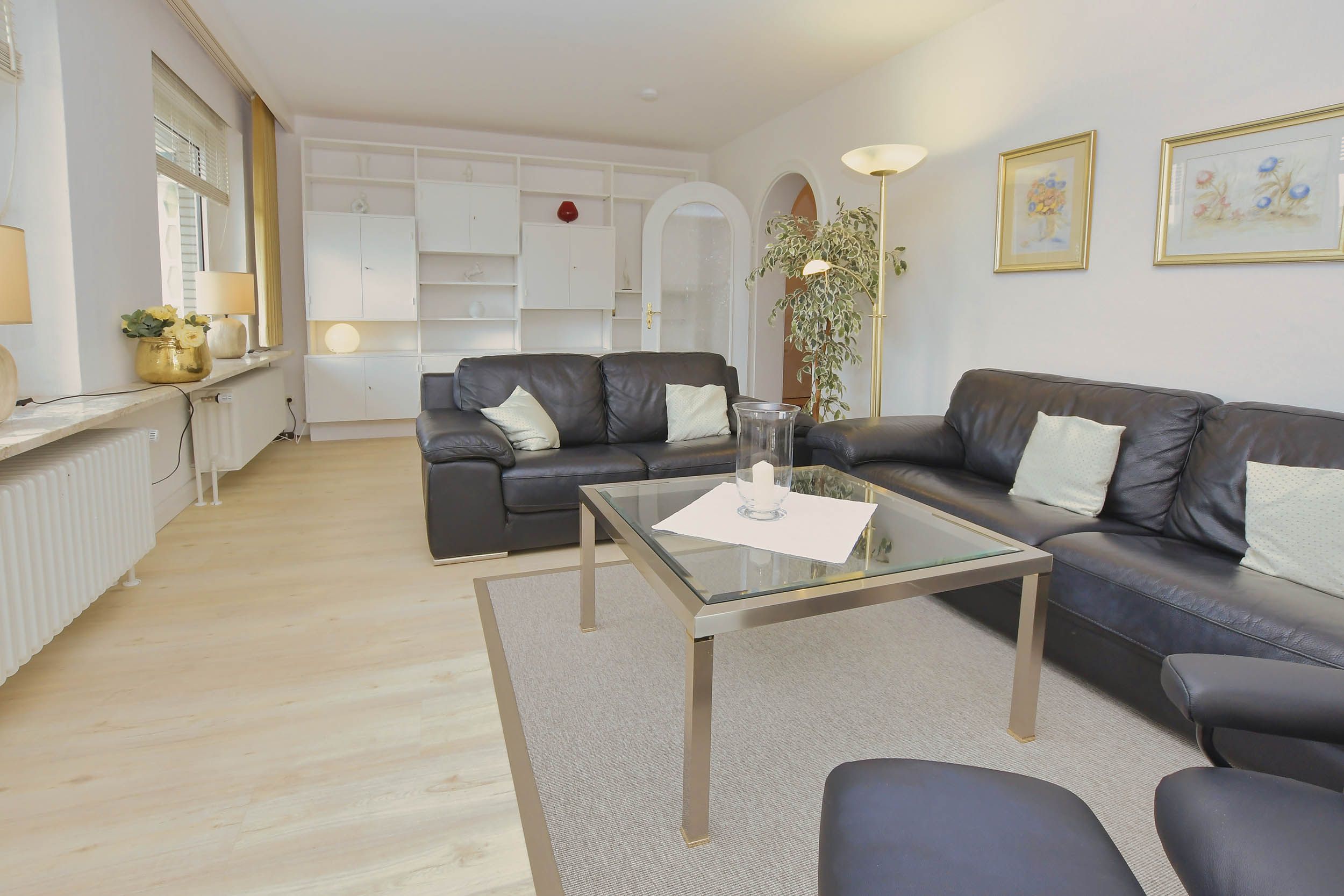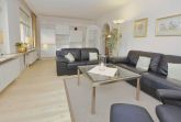 Wohnzimmer mit hochwertiger Schlafcouch, Sitzgruppe, Eßplatz , Fernseher und Stereoanlage.