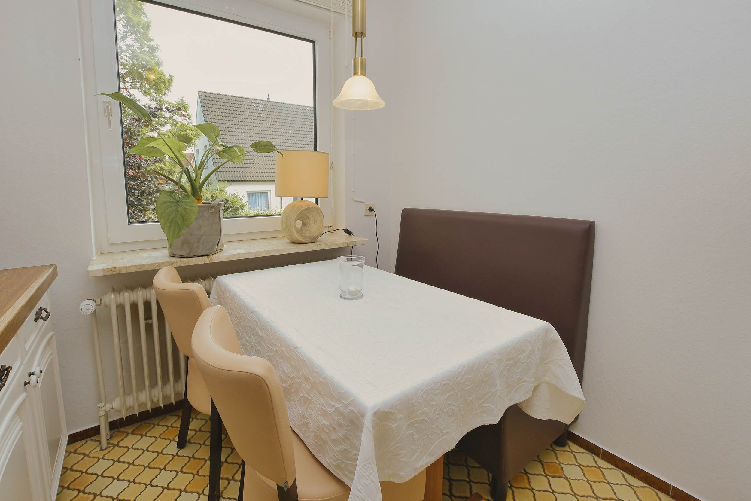 Separate Küche mit Eßplatz, Herd mit 4 Kochfeldern und Backofen, Grill, Mikrowelle, Dunstabzugshaube, Geschirrspüler, Kühlschrank mit Gefrierfach, Kaffeemaschine und sonstigen Küchengeräten. Sie ist komplett bestückt mit Geschirr, Bestecken, Töpfen, etc.