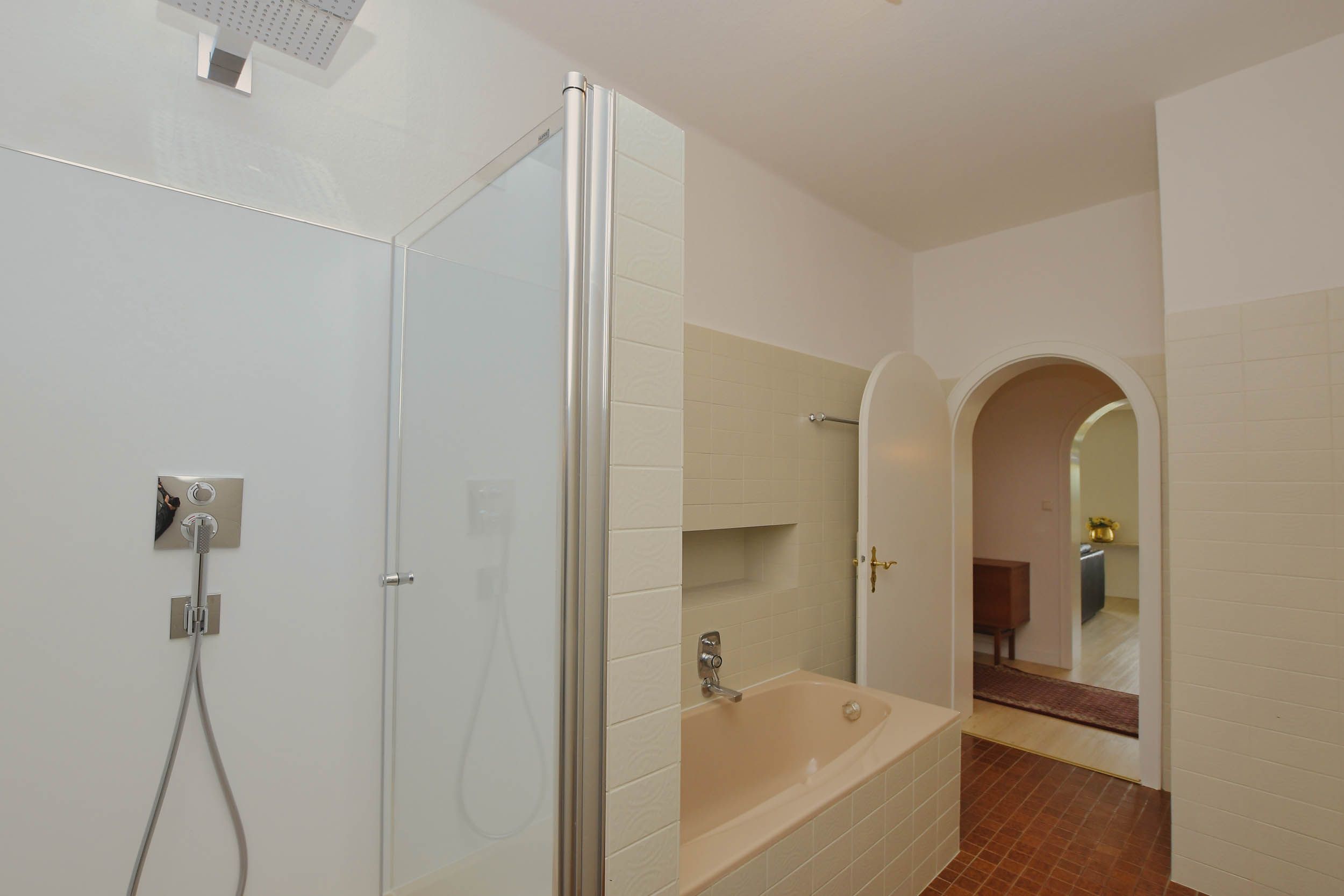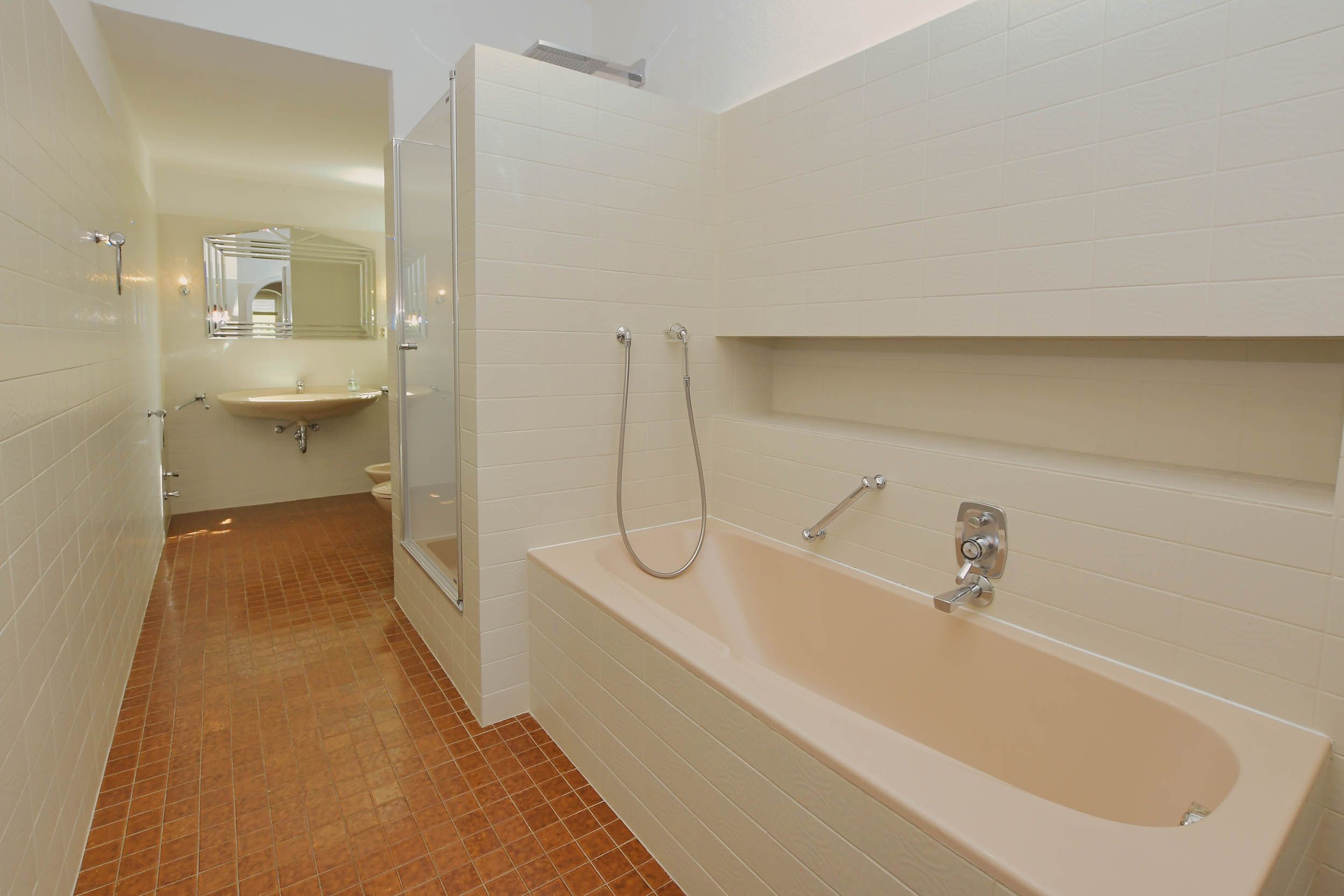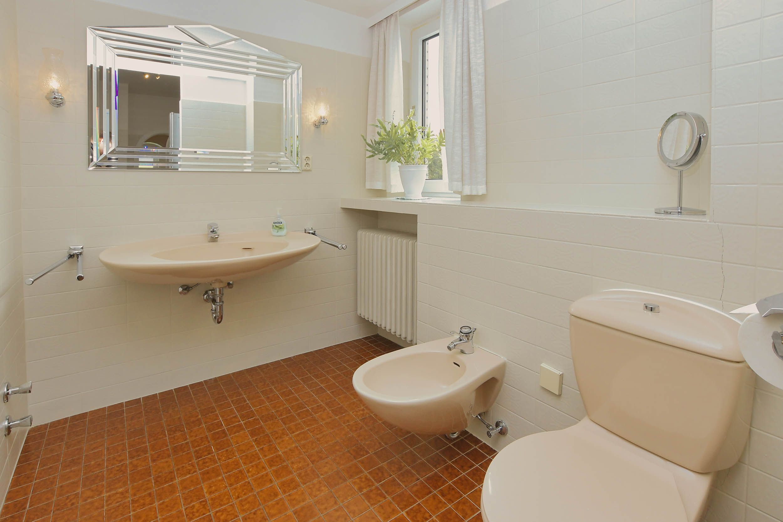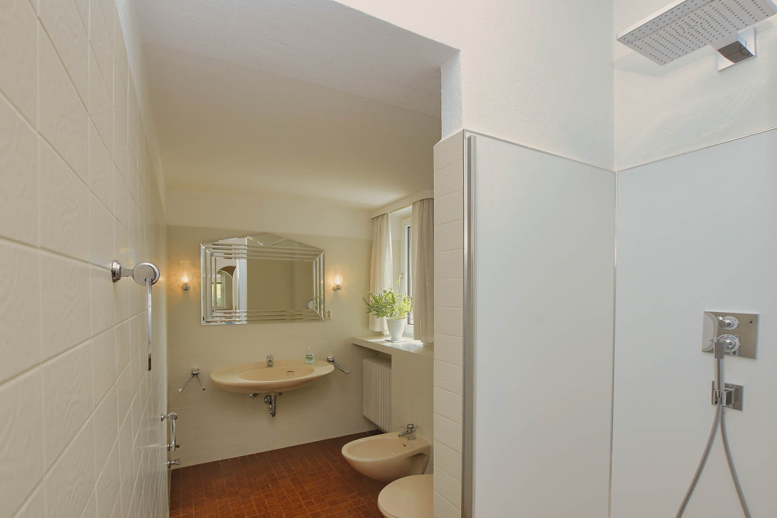 Das Bad ist ausgestattet mit Dusche, WC, Bidet, großem Waschtisch mit Spiegel, ausreichend Ablageflächen, Fußbodenheizung, Handtuchtrockner und Radio.