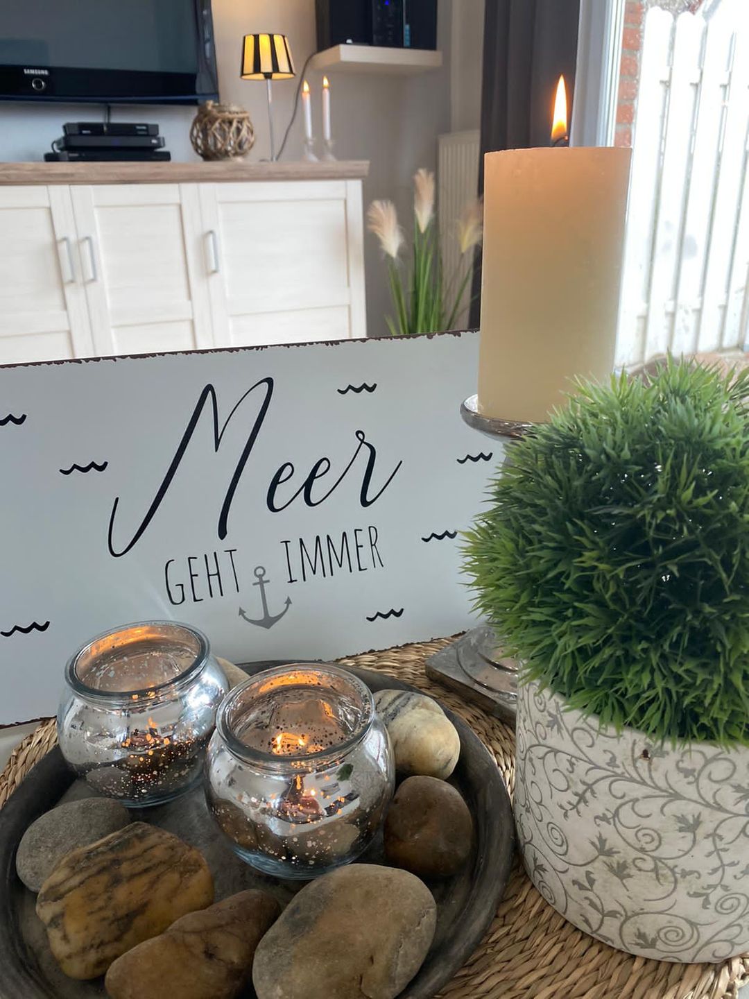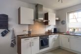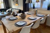 Im hellen, modern eingerichteten Wohn- und Esszimmer verfügen Sie über eine komfortable Sofalandschaft mit TV-Gerät, WLAN und Kamin und großzügigem Esstisch. Die Küche befindet sich ebenfalls hier und bietet Ihnen eine große Auswahl an technischen Geräten, um sich optimal selbst zu versorgen. Dazu gehören unter anderem ein Kühlschrank mit Gefrierfach, ein Herd mit Backofen, eine Geschirrspülmaschine, Kaffeemaschine, Wasserkocher, Toaster und vieles mehr.