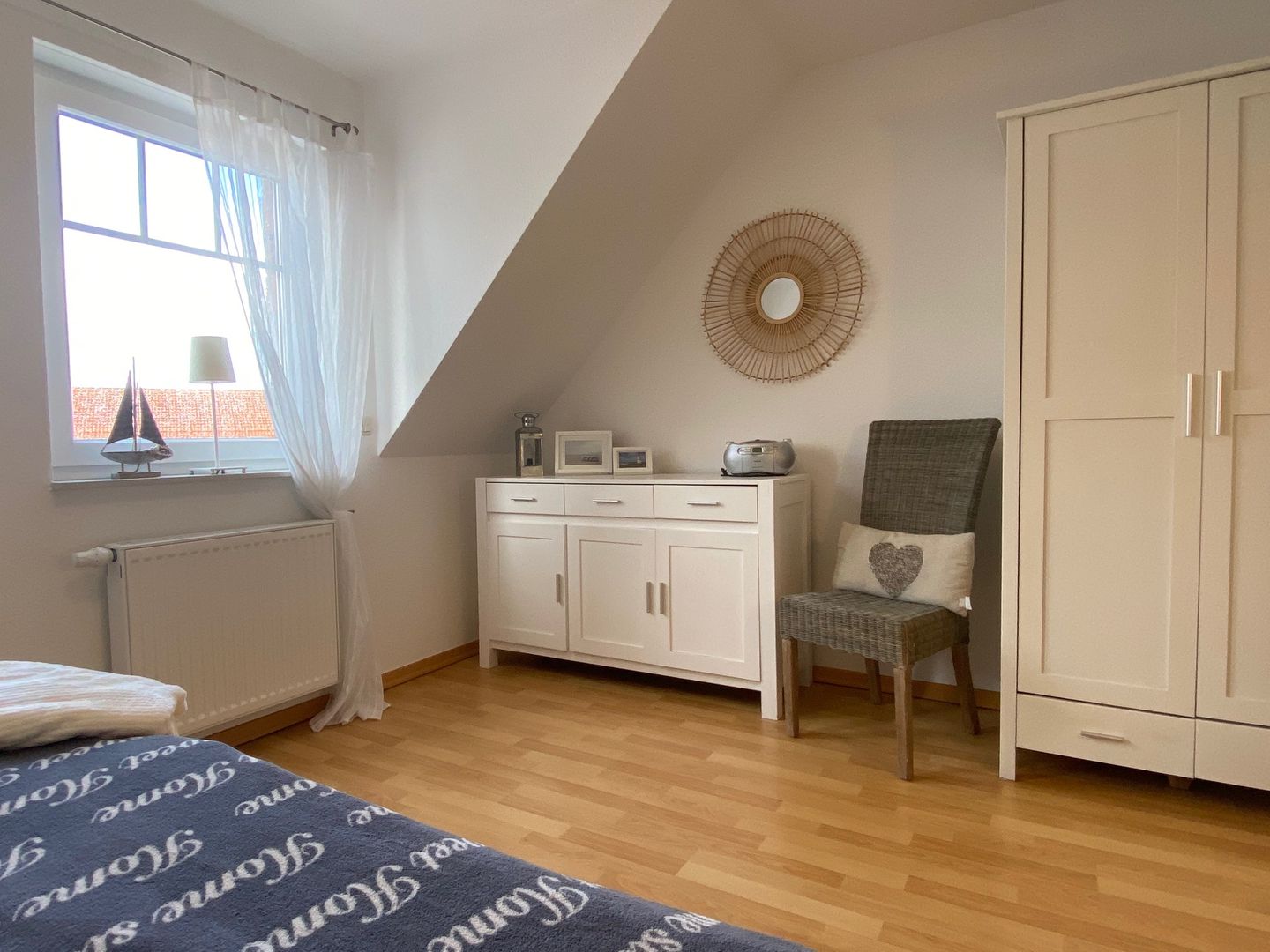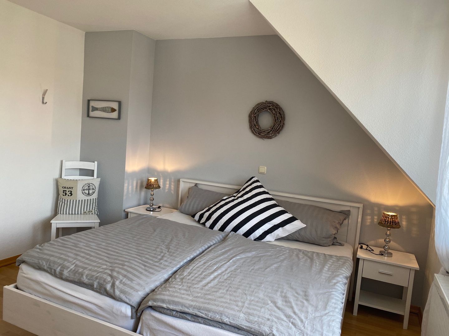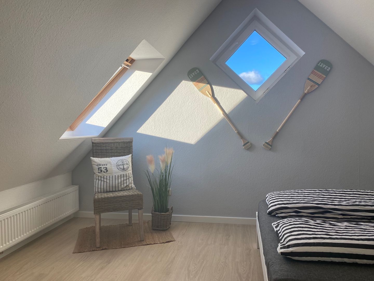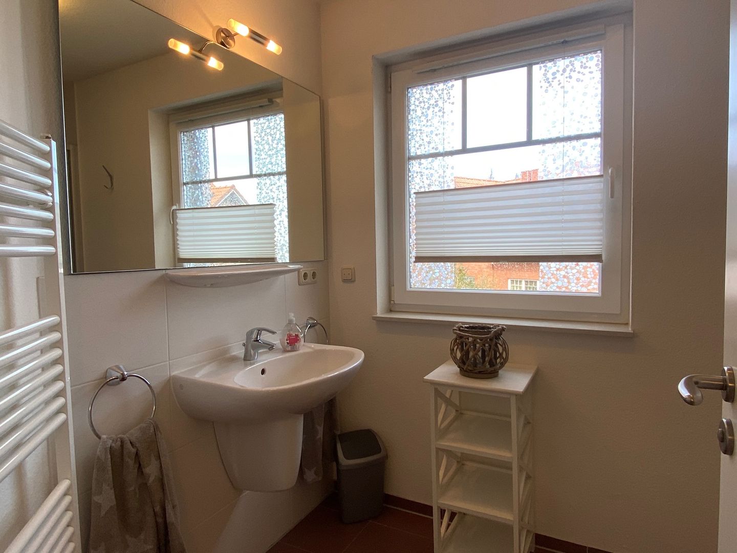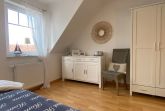 Die oberen beiden Etagen des Hauses bieten Ihnen vier separate Schlafzimmer mit Doppelbetten (1x mit durchgehender Matratze) und genügend Stauraum für Ihre Garderobe. Das Badezimmer ist mit einer Dusche, Waschtisch, Handtuchheizkörper und WC ausgestattet.