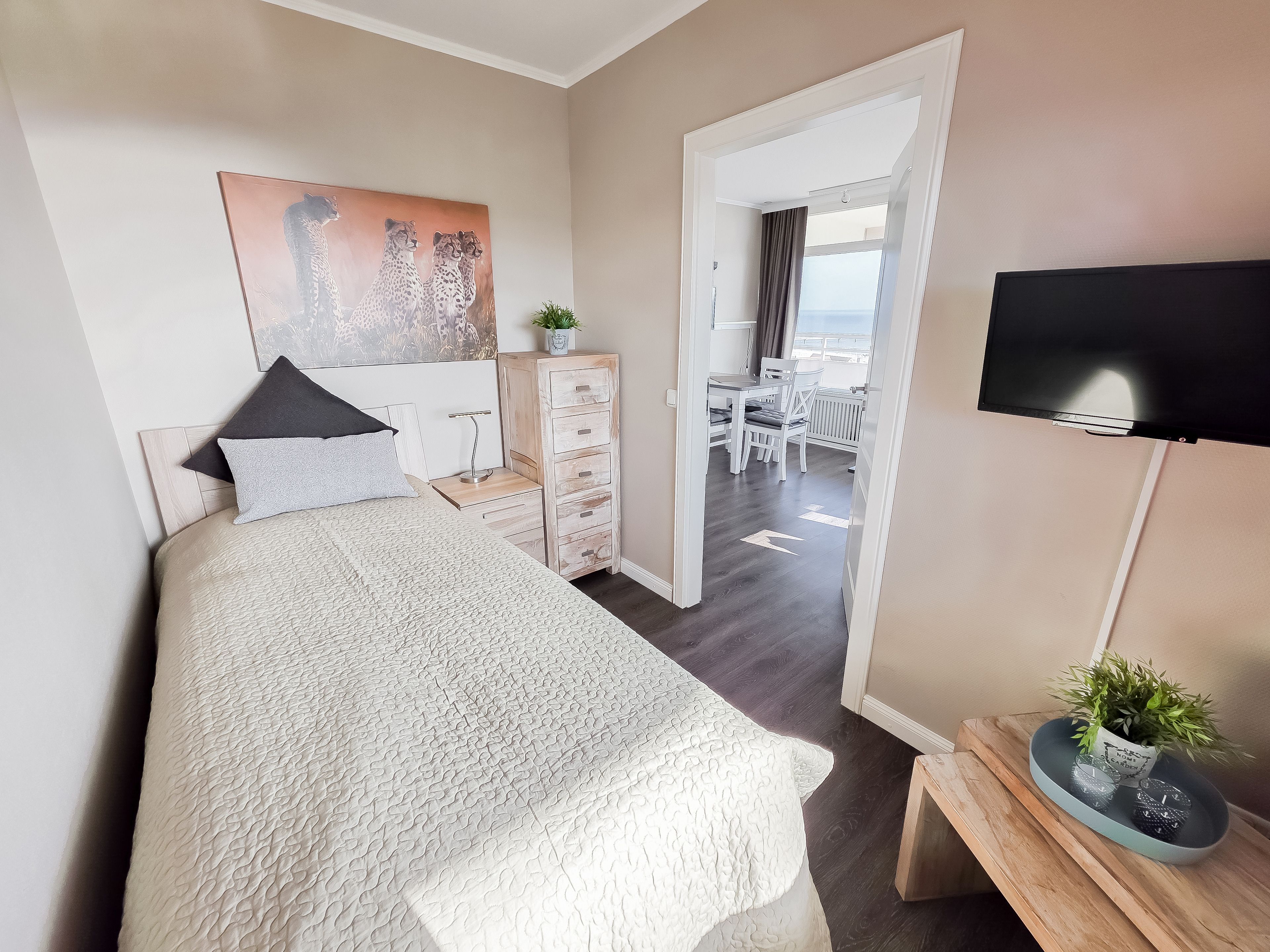 Vom Wohnzimmer gelangen Sie weiter in das separate Kinderzimmer, das über ein Einzelbett und einen Flach-TV verfügt.