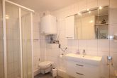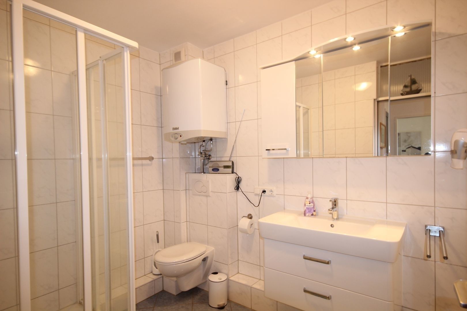 Im hellen Bad ist eine Dusche, WC und Waschbecken.