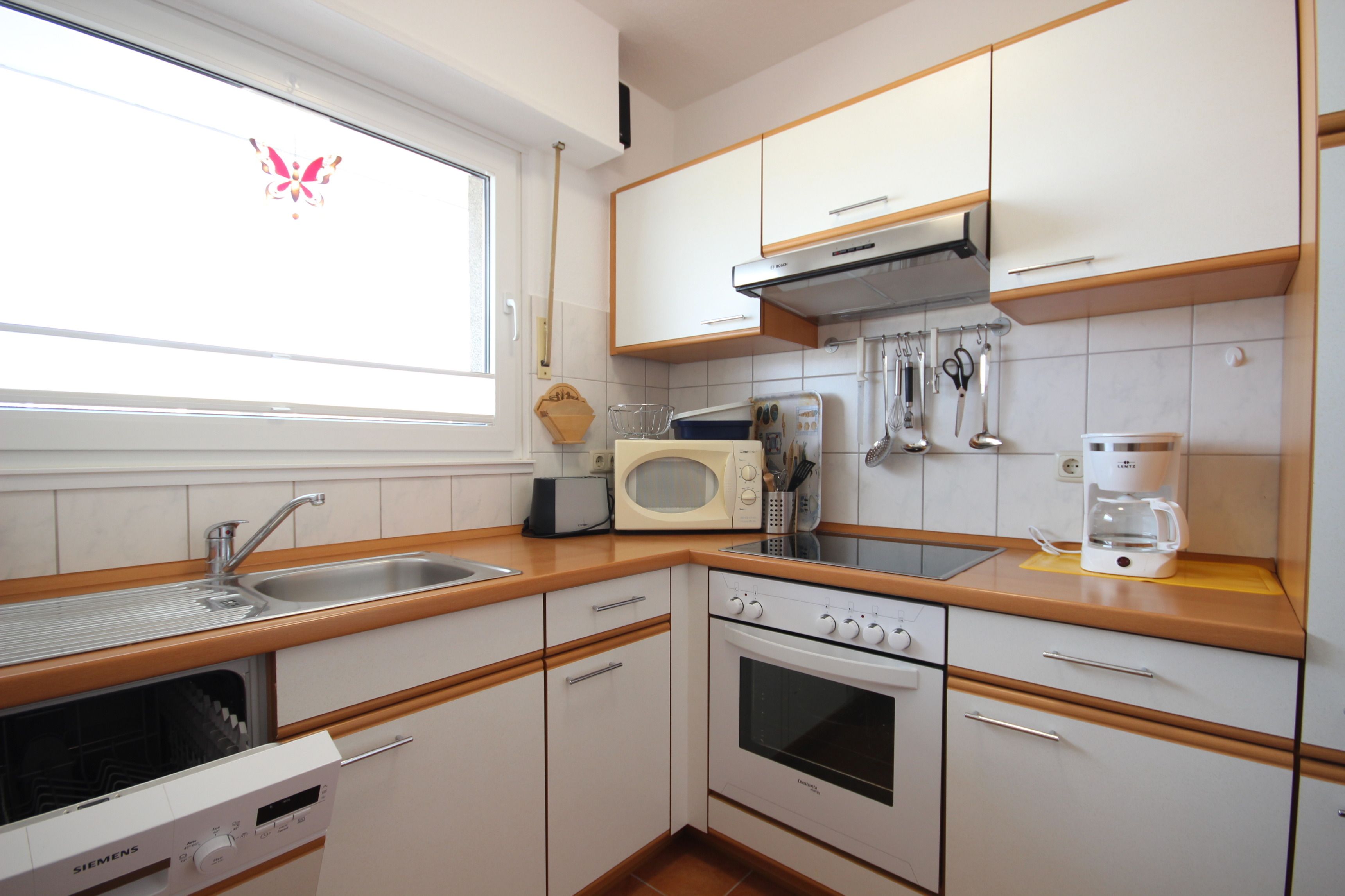 Die moderne Einbauküche ist mit Backofen/ Cerankochfeld, Mikrowelle, Geschirrspüler, Kühlschrank sowie den üblichen Küchengeräten sehr gut ausgestattet.