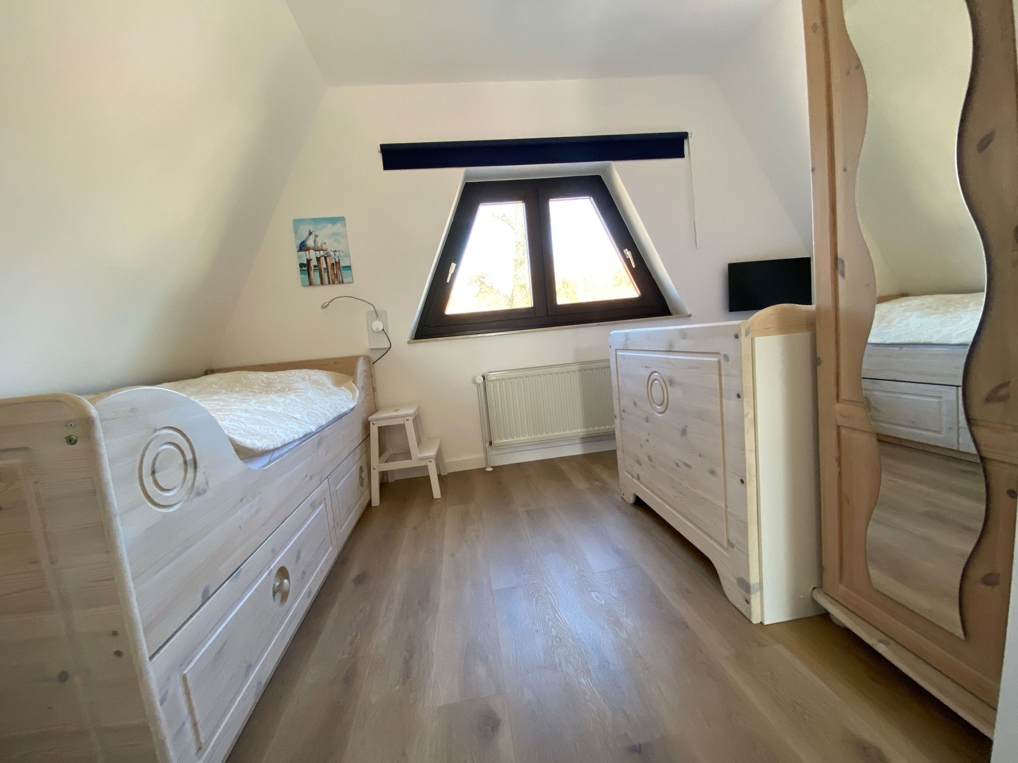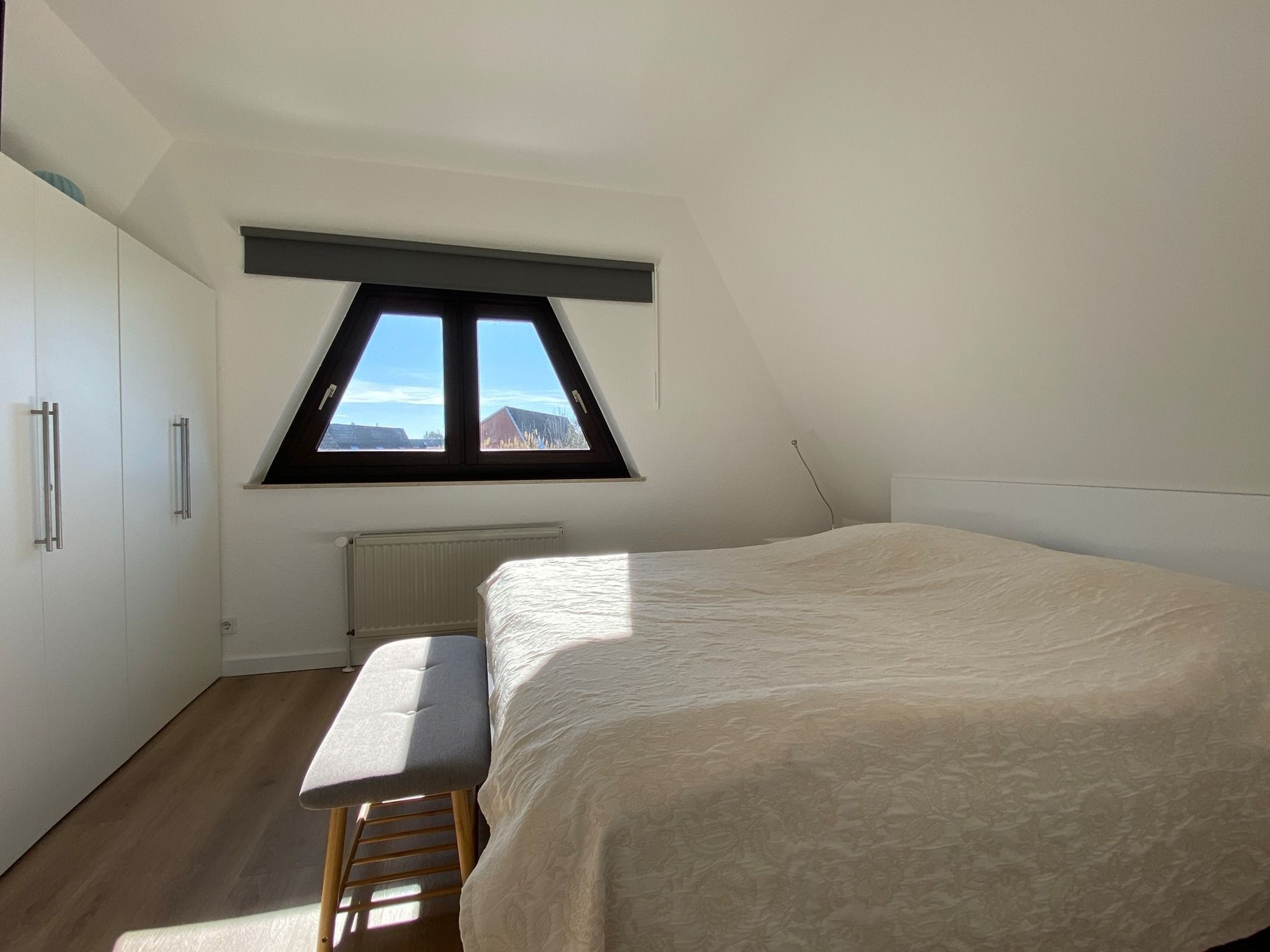Im OG befindet sich ein Schlafzimmer mit Doppelbett & Kleiderschrank.