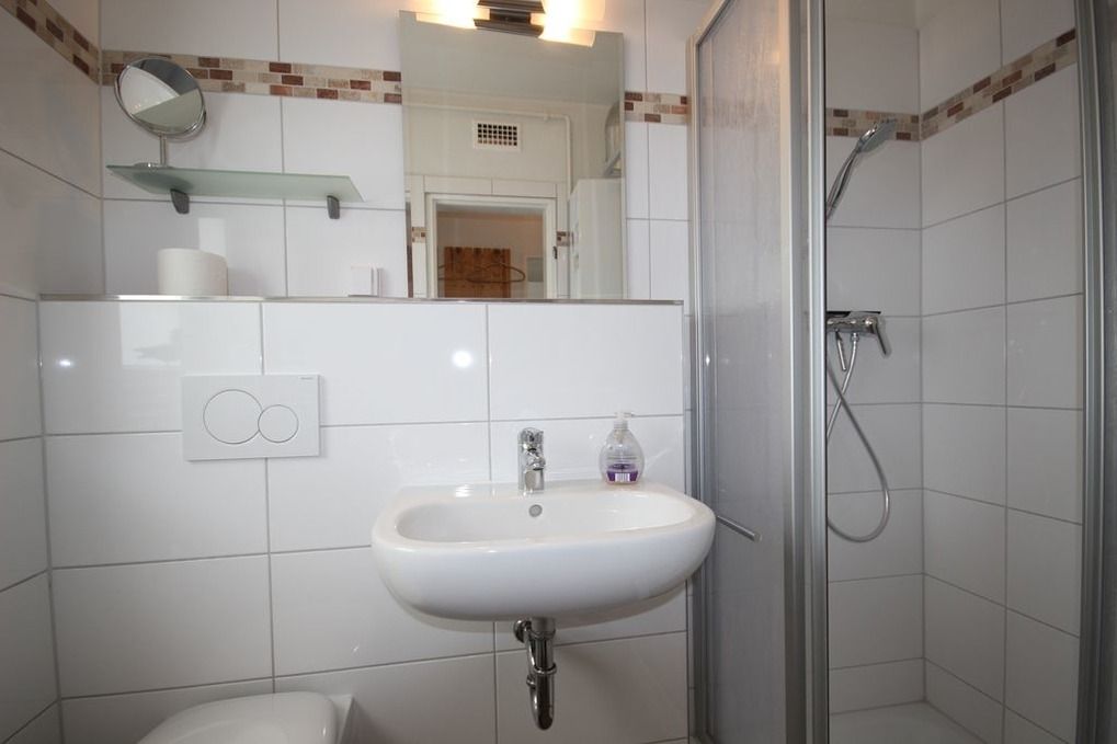 Das Duschbad ist hell gefliest und hat eine Duschkabine mit Trennwand.