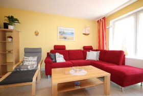 Der großzügige Wohnbereich ist mit einer bequemen Sofagarnitur, Essplatz, TV & Radio optimal eingerichtet.