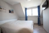 Im Obergeschoss liegen 2 Schlafzimmer mit Doppelbett & Kleiderschrank sowie ein Vollbad mit WC & Waschbecken.