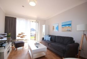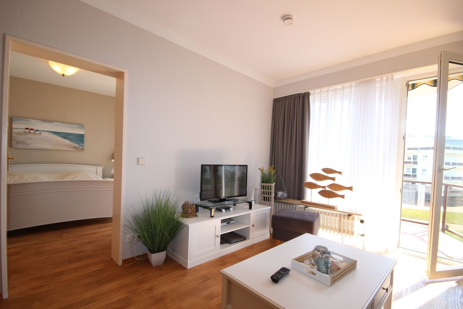 Auf ca. 50 m² bietet diese Ferienwohnung ein gemütliches, helles Wohnzimmer mit einem bequemen Schlafsofa, Schrankwand, TV, Radio & Zugang zum möblierten Süd-Balkon mit Teilmeerblick + Markise.