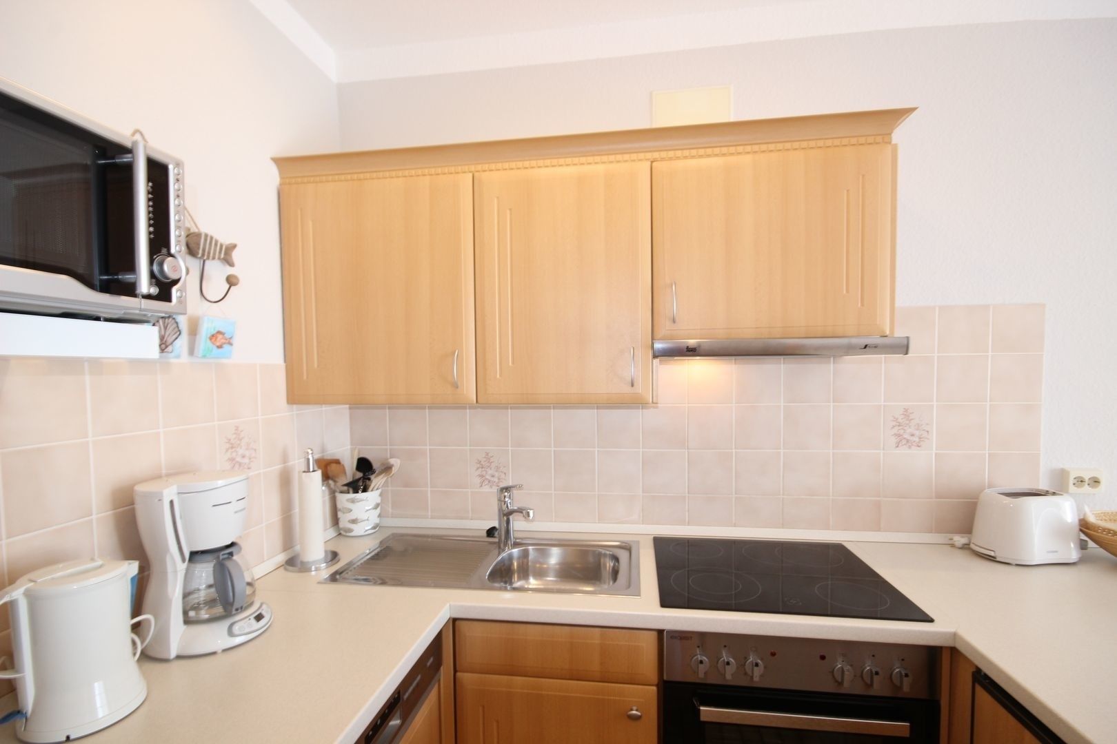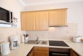Die offene Einbauküche mit Esstresen für 4 Personen ist mit Cerankochfeld/ Backofen, Kühlschrank, Spülmaschine sowie den üblichen Küchengeräten sehr gut ausgestattet.