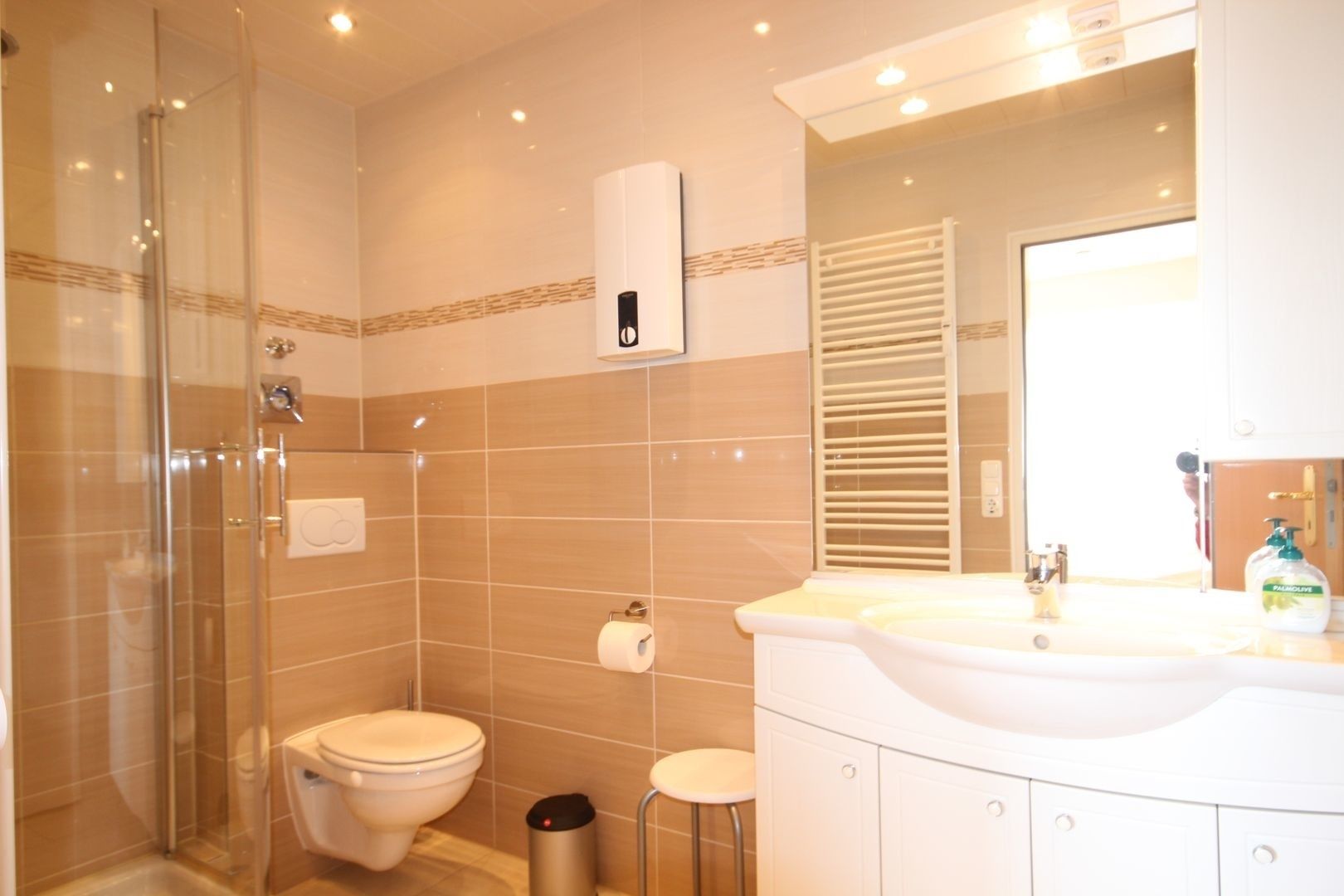 Schönes, modernes Bad mit Eckdusche/Glastür, Waschbecken, WC & Handtuchheizkörper.