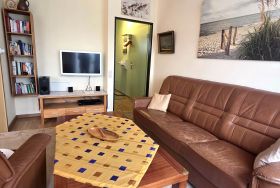 Komfortables Wohnzimmer mit bequemer Couchgarnitur, Flachbild-TV, Schrank, Anrichte & Zugang zum sonnigen, möblierten Süd-West-Balkon Meerblick.