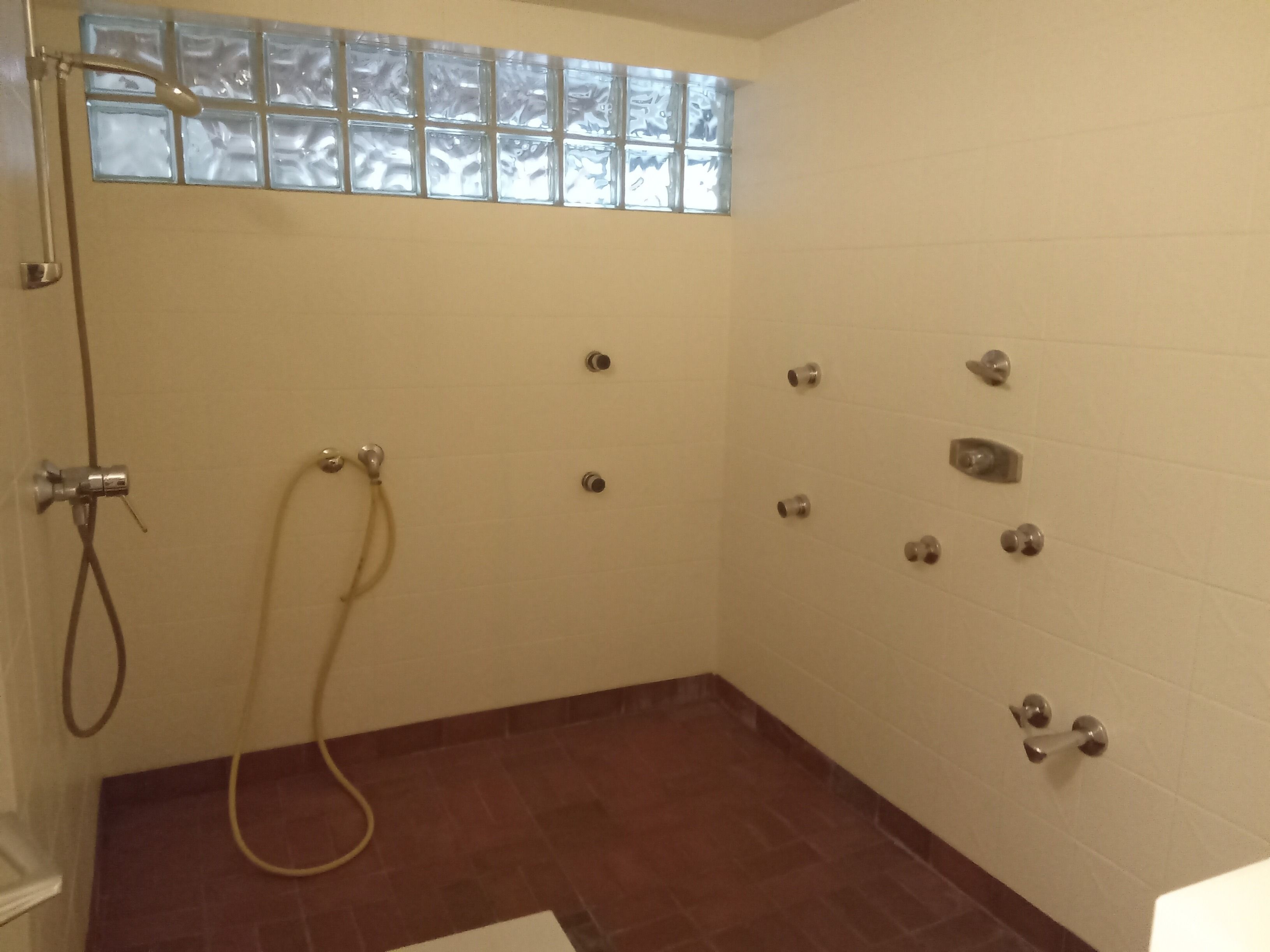 Hell gefliestes Bad mit Dusche/ Trennwand, WC und Waschbecken.