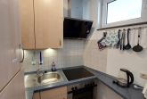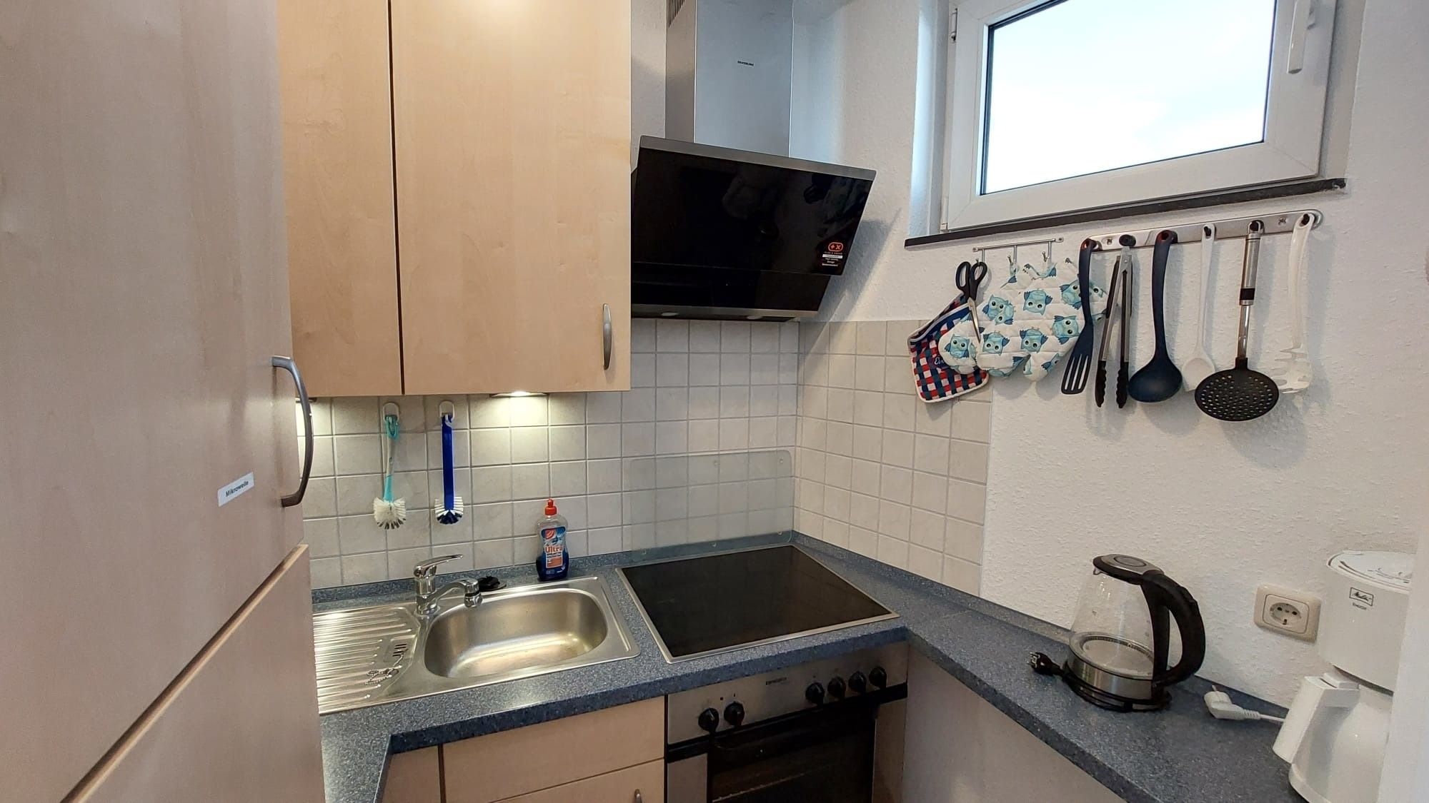 Die Küche mit Fenster ist mit Cerankochfeld, Backofen, Mikrowelle, Kühlschrank & den üblichen Küchengeräten gut ausgestattet.