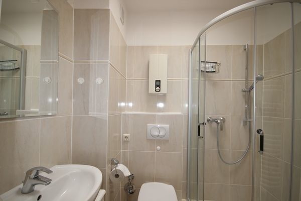Das Bad mit Lichtkuppel ist mit Dusche, Waschbecken, WC & Handtuchheizkörper ausgestattet.