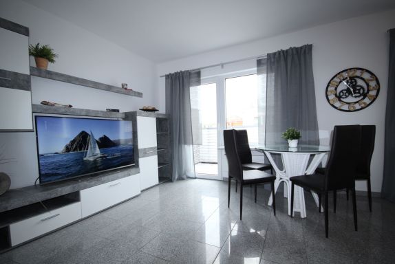 Im Wohnbereich befindet sich ein Essplatz für 4 Personen, Sideboard mit 55 Zoll Smart-TV und eine gemütliche Couchgarnitur zum Relaxen (auch zum Schlafen für 2 Personen geeignet). Balkon. Hier können Sie Ihre Urlaubstage genießen.