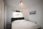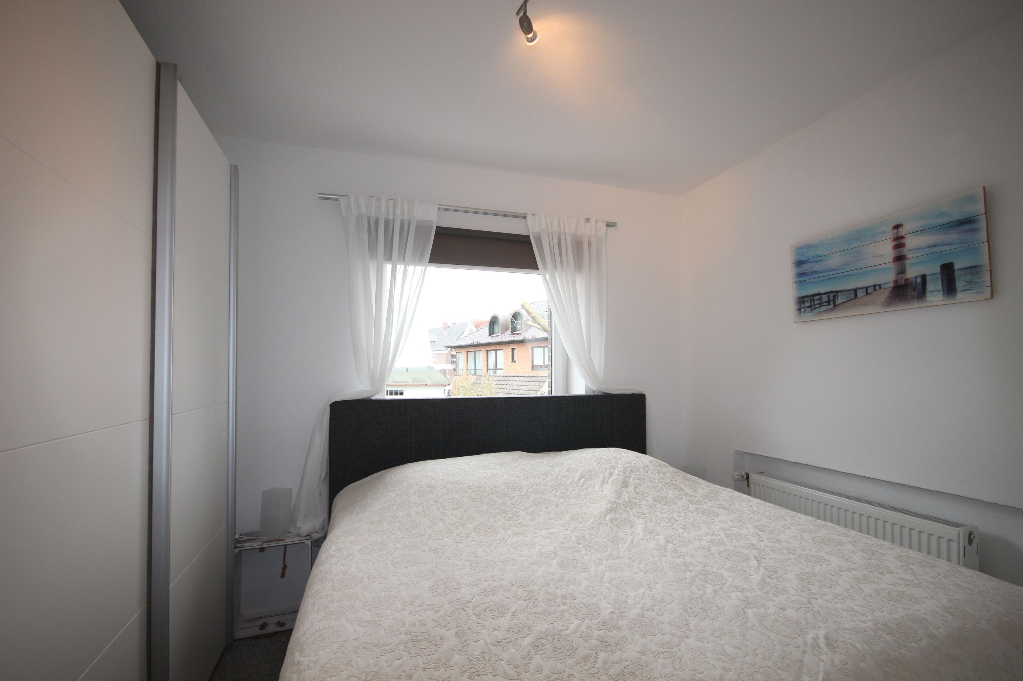 Das Schlafzimmer verfügt über ein bequemes Boxspringbett (ca. 180 cm breit mit einer durchgehenden Matratze) und Kleiderschrank.