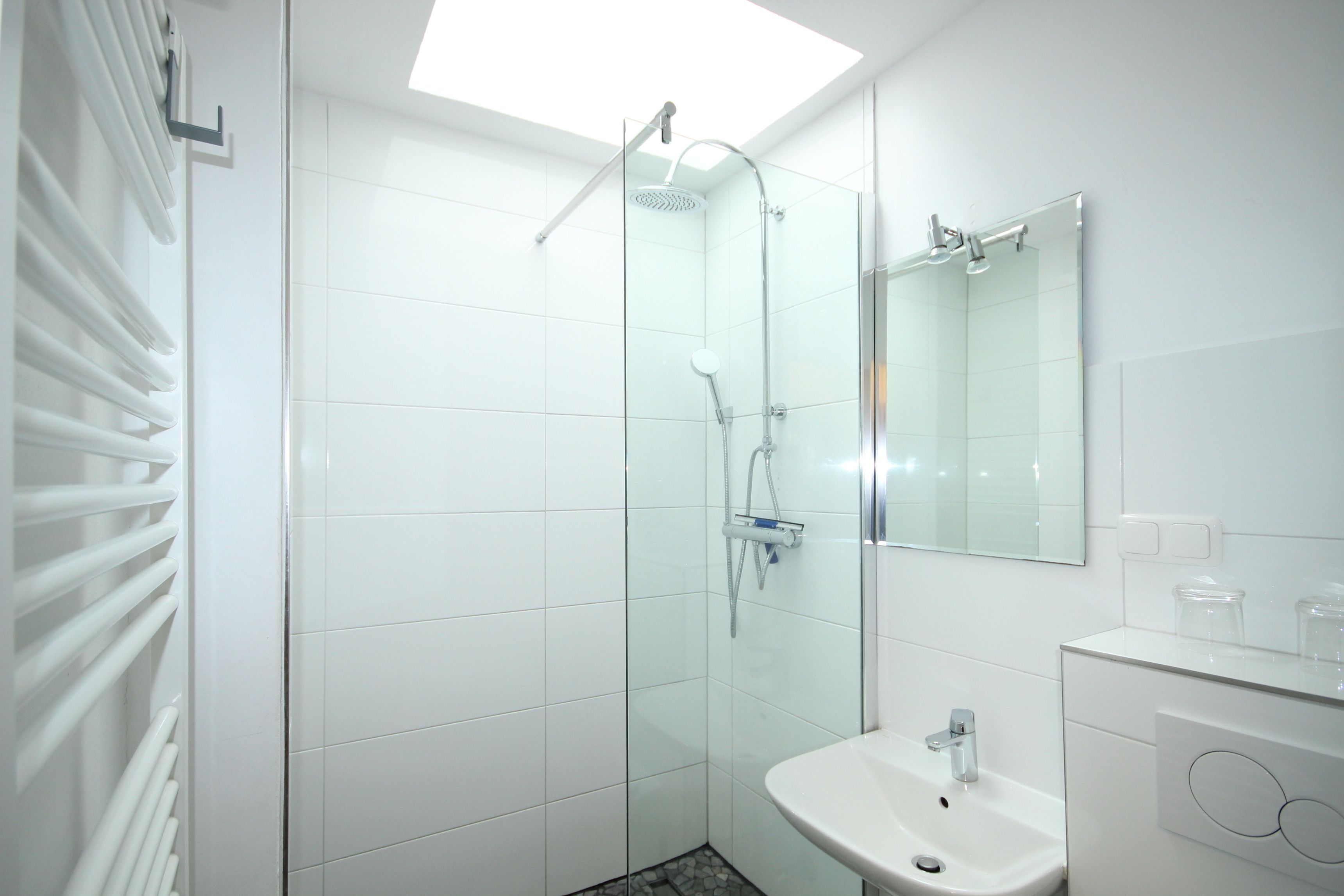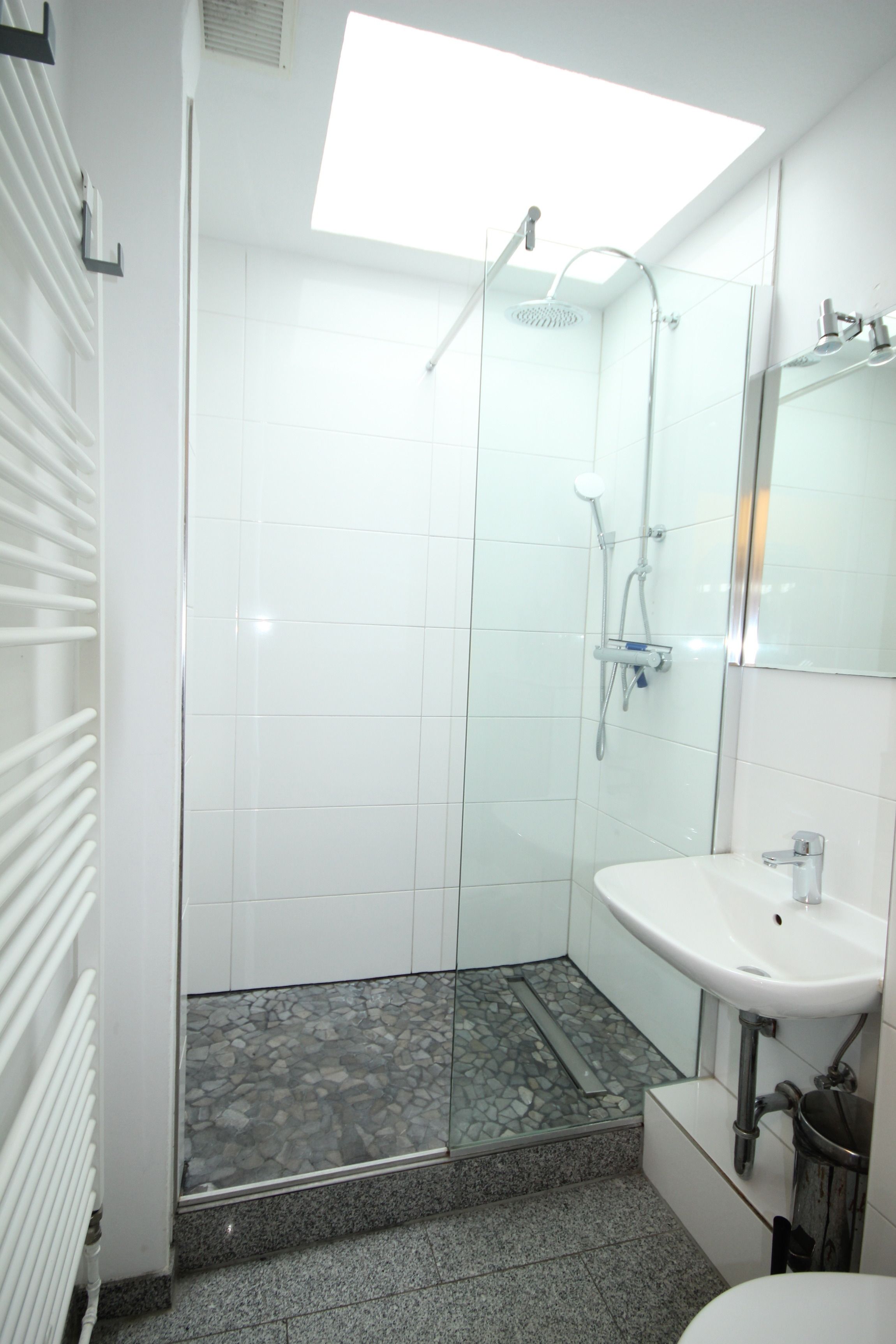 Eine helles, freundliches Bad, Waschbecken, WC und Handtuchheizkörper ist vorhanden.