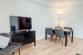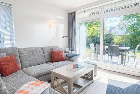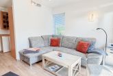 Das gemütliche Wohnzimmer ist ausgestattet mit einem schönen Sofa, Essplatz für 4 Personen, TV und hat Zugang zur möblierten, sonnigen Terrasse.