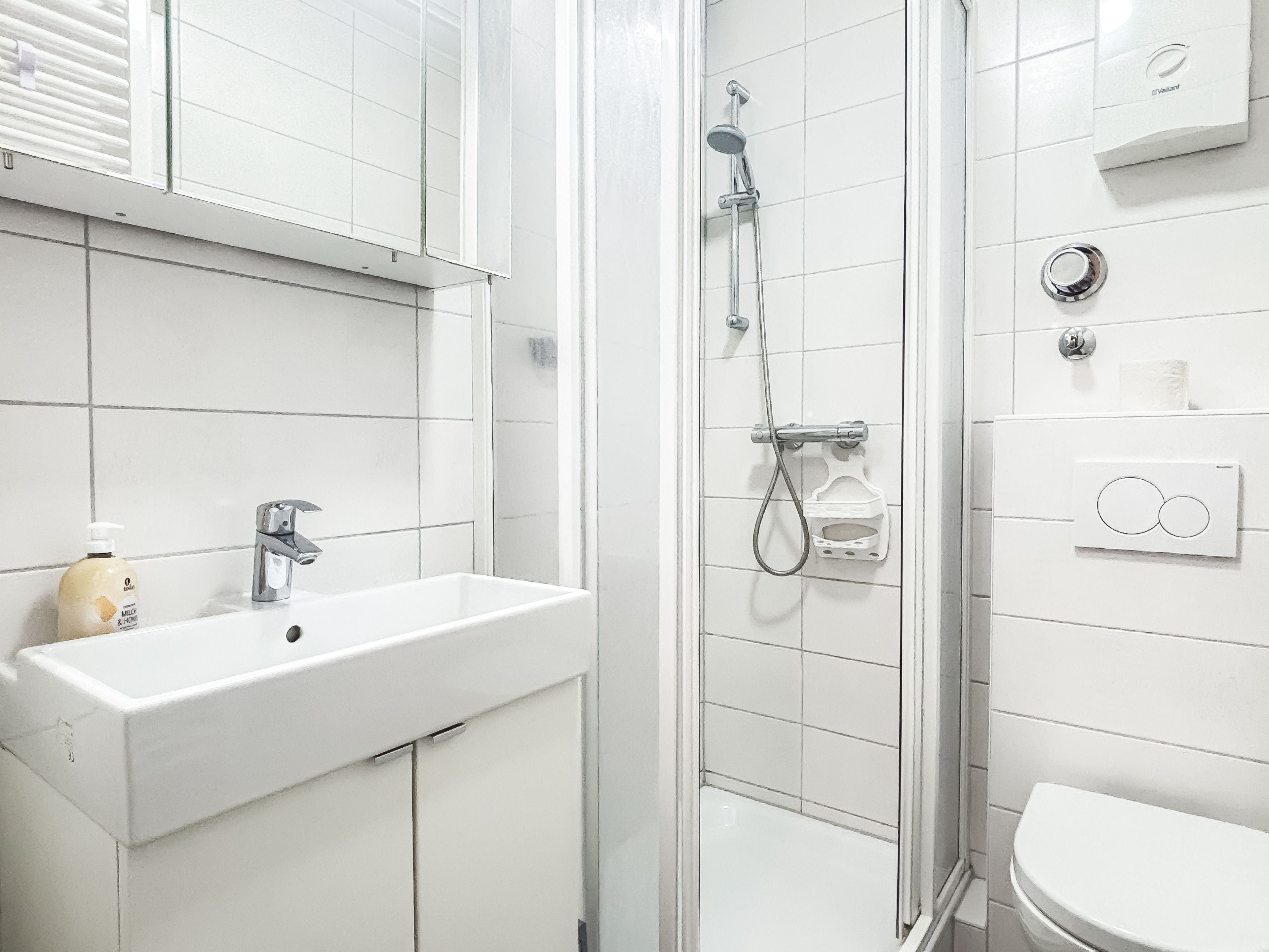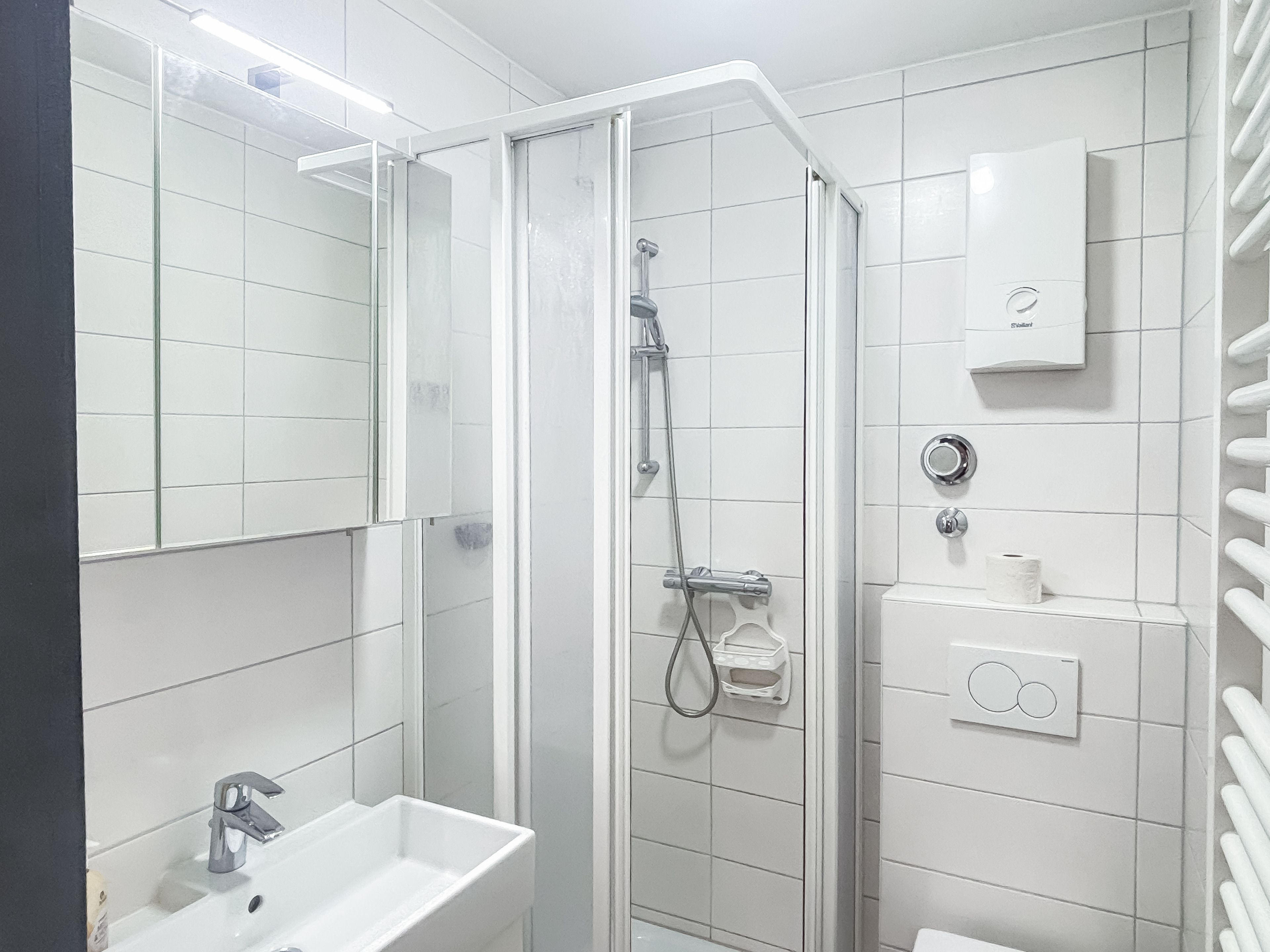Hell gefliestes Duschbad mit Eckdusche/ Glastrennwand, Waschbecken & WC.