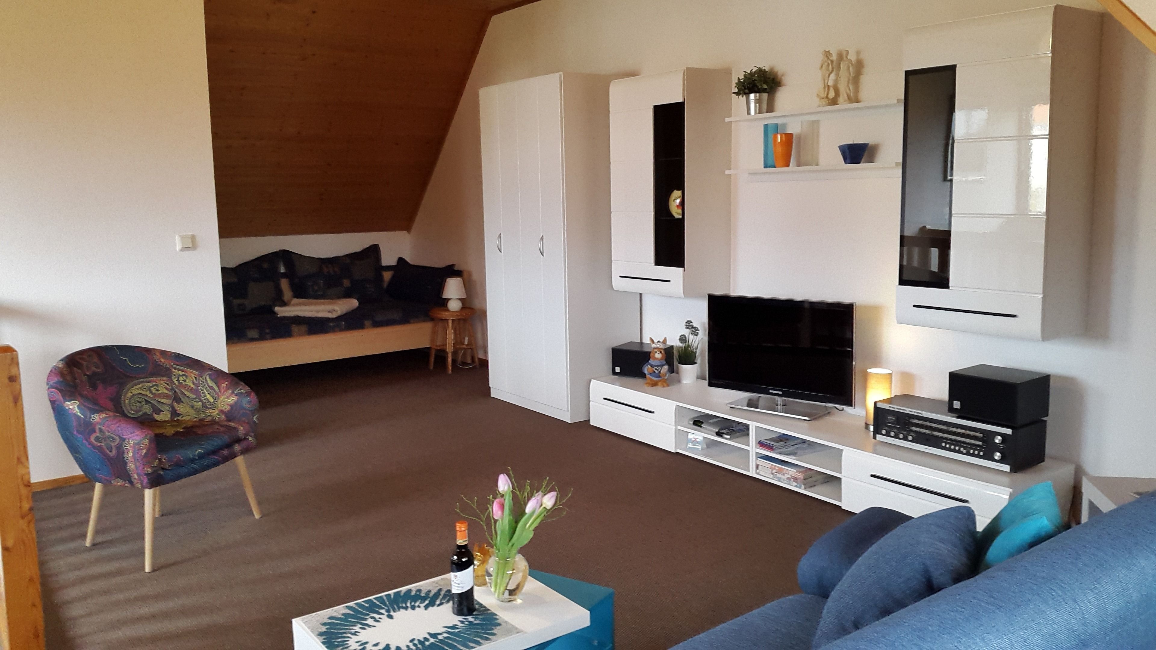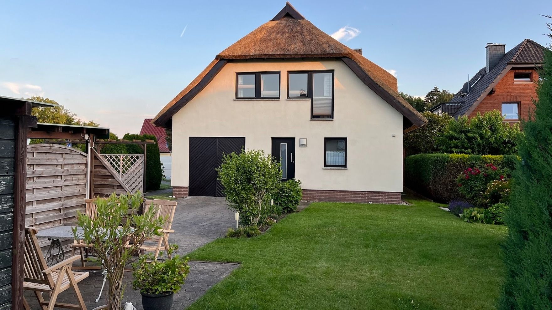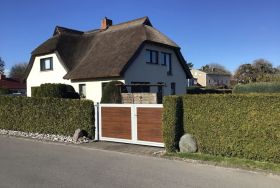 Die Wohnung hat ca. 50 m2 über zwei Etagen mit moderner Ausstattung und allem was man im Urlaub so benötigt, z. B. Kaffeemaschine, Filtertüten, Kapselmaschine von Tschibo für Kaffee und Espresso, Toaster, Ceran-Herd mit Backofen, Sat-.Fernseher und WLAN. Der PKW, keine Van und Fahrräder können auf dem Grundstück unter dem Carport abgestellt werden. Auf dem Grundstück ist eine separate Sitzecke für unsere Gäste vorhanden. Grillen ist nicht möglich. Zum Strand und einem kleinen EDEKA sind es nur wenige Minuten.