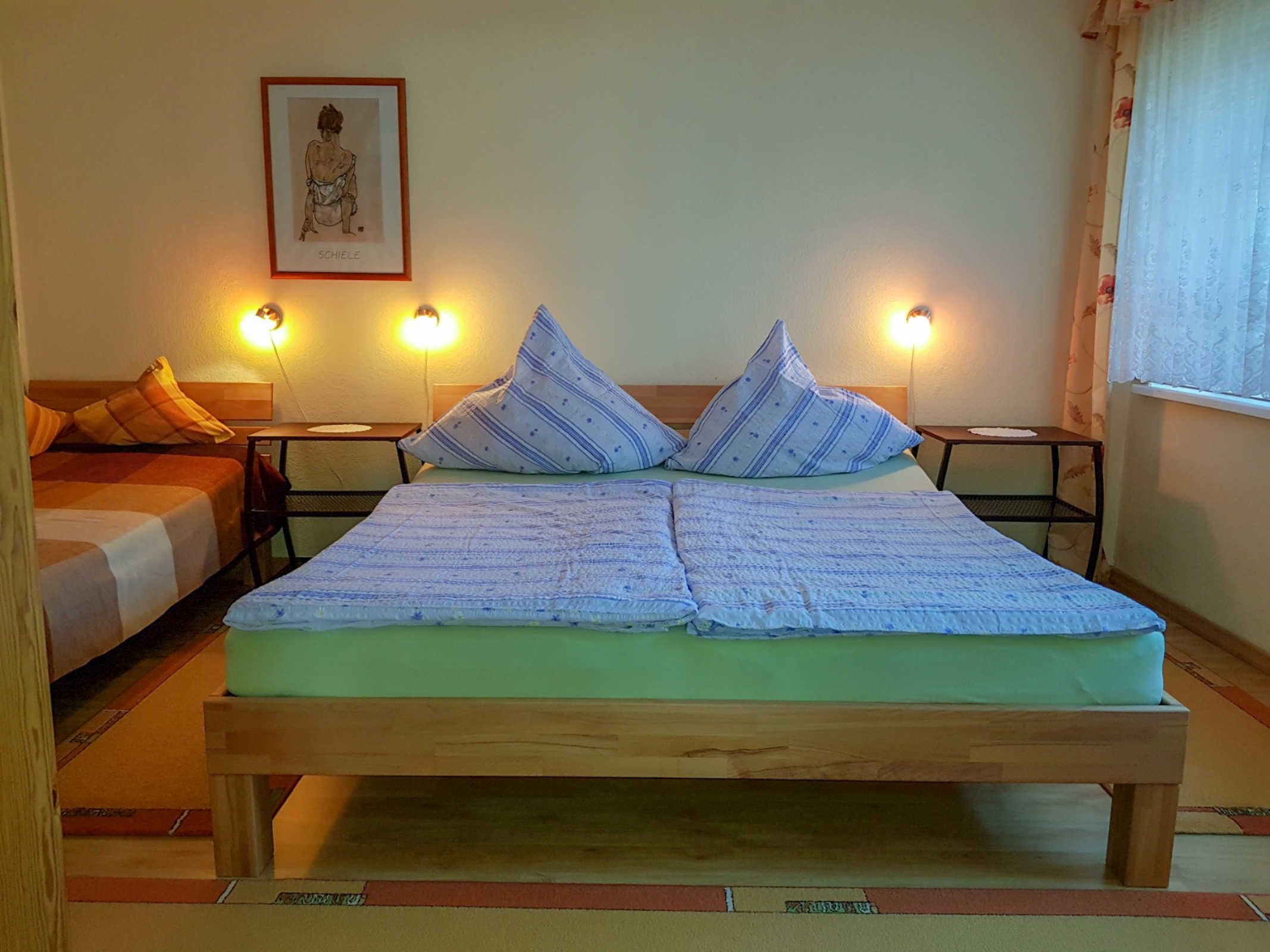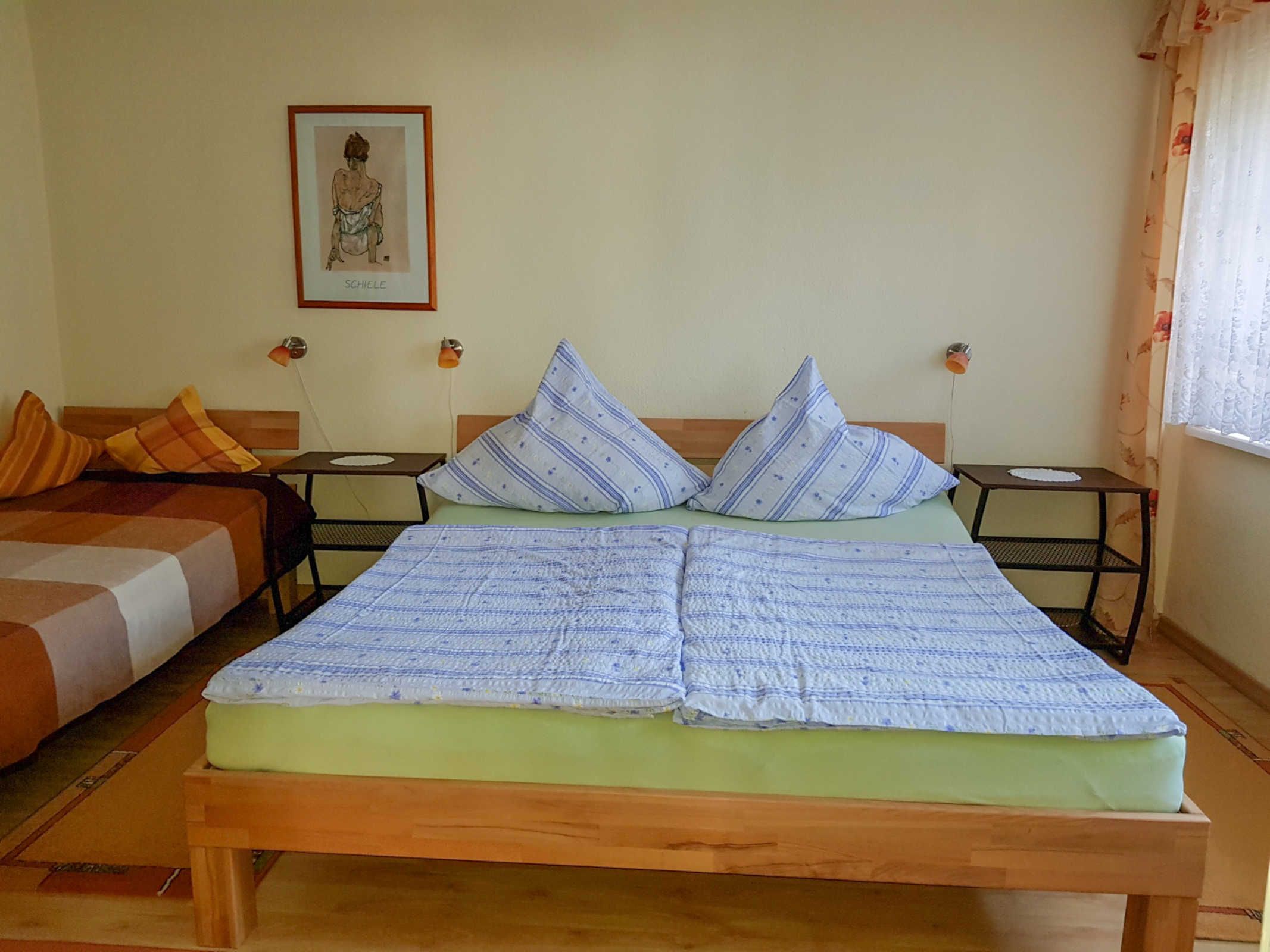 1 Schlafzimmer mit Doppelbett und Einzelbett;(Laminatboden) sowie optional Kinder-Reisebett,