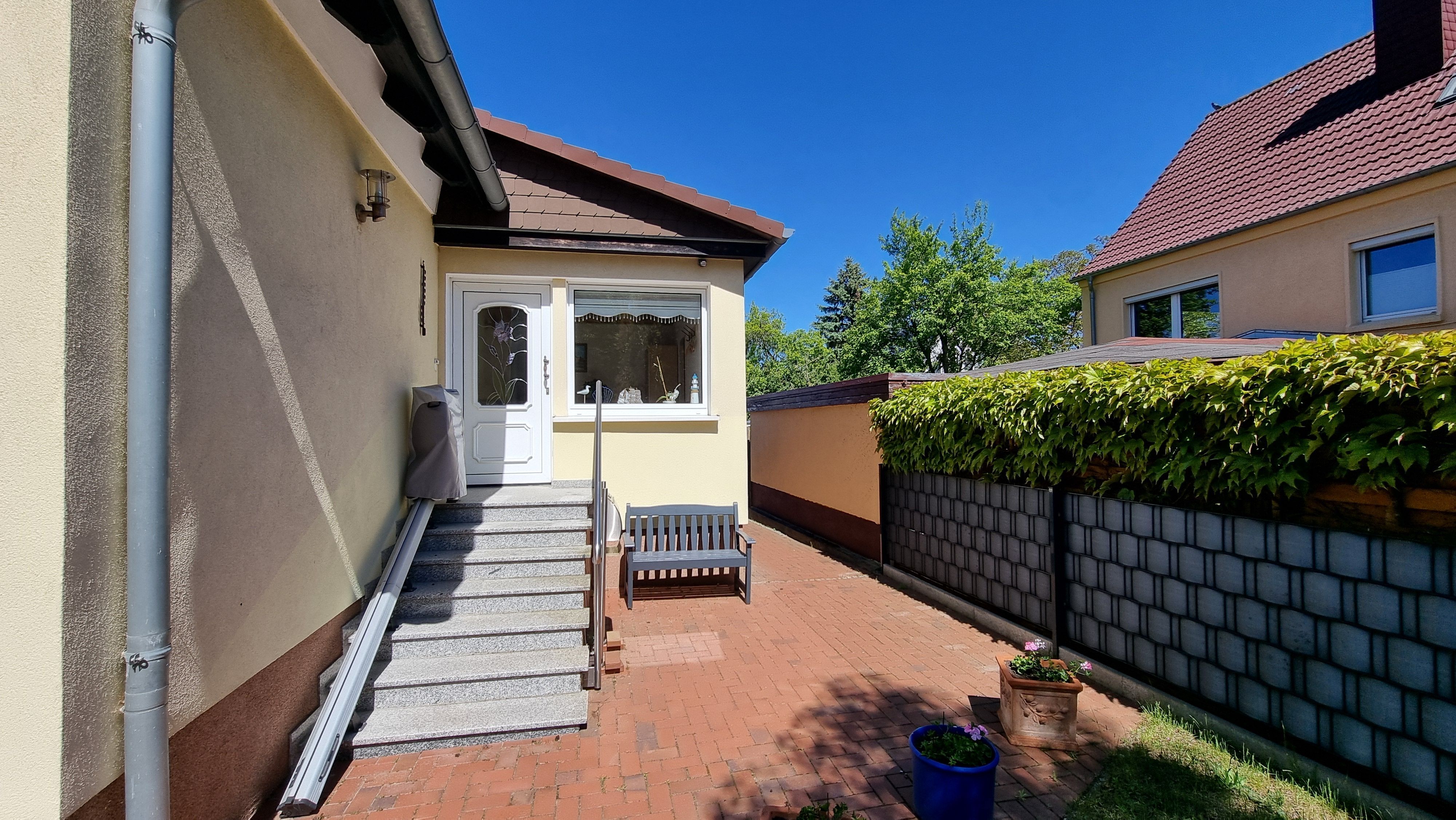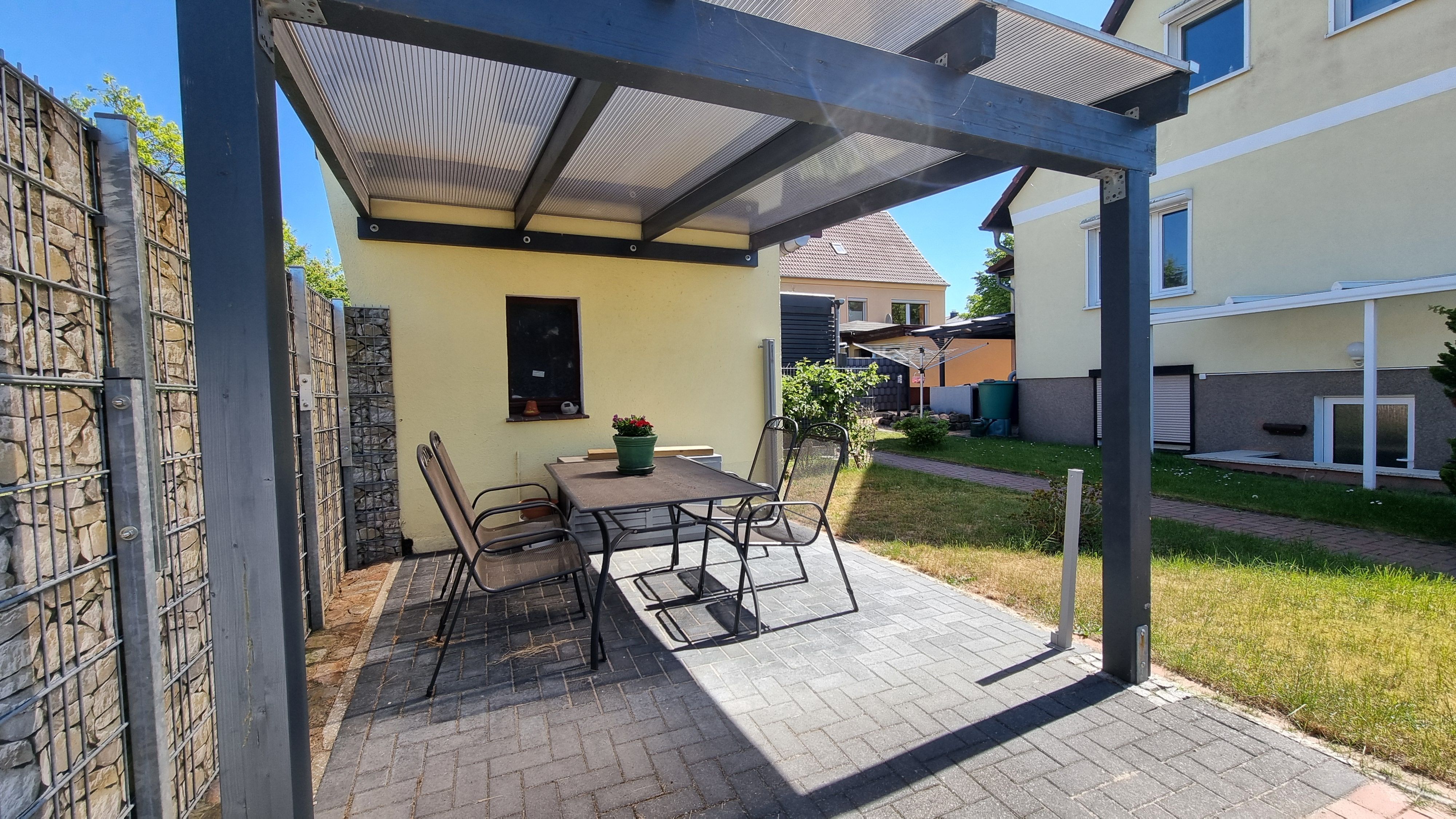 • Terrasse mit Möbeln, Grill und Überdachung