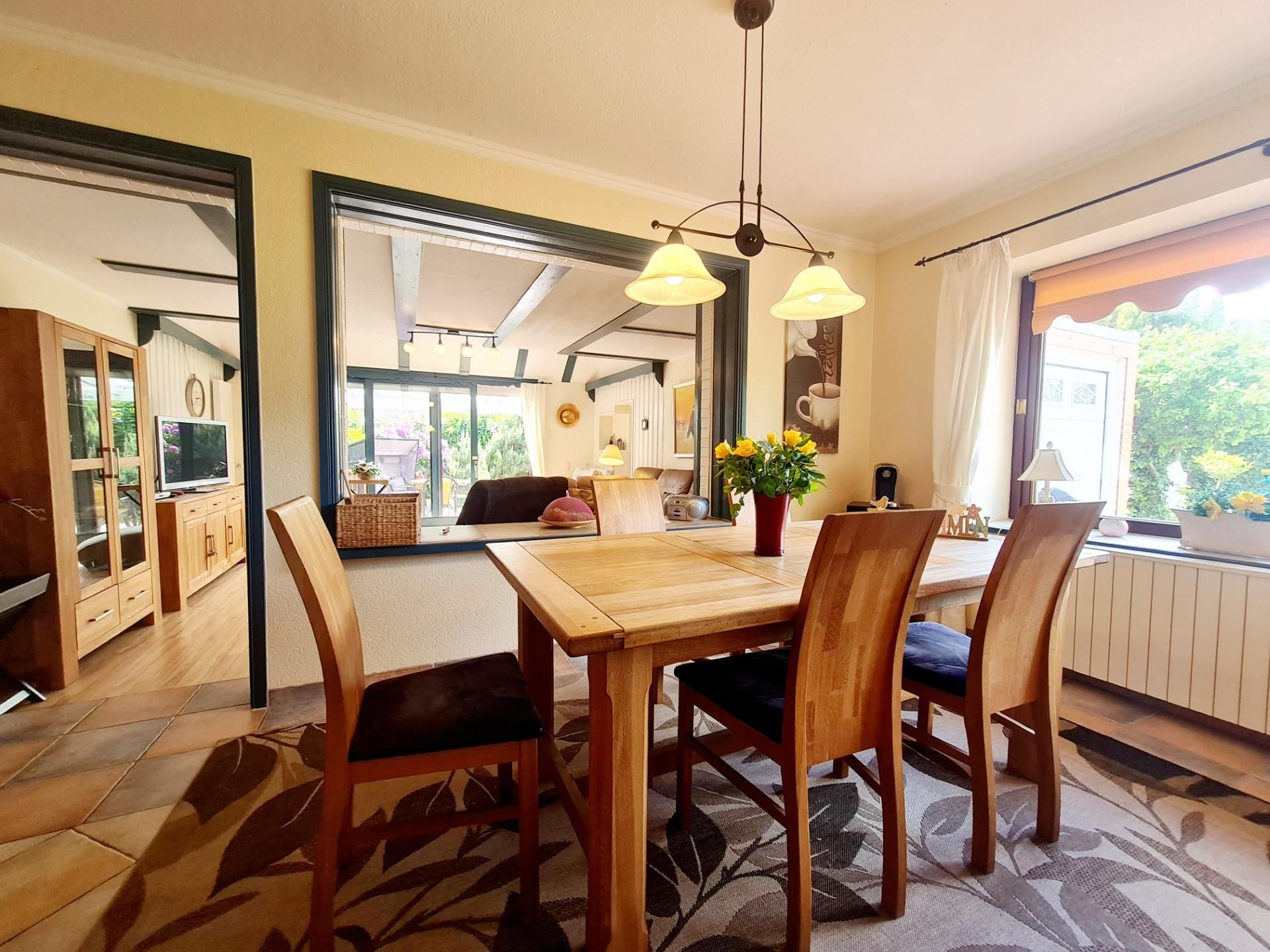 Vom Wohnzimmer weiter in das offene, ca. 20qm Eßzimmer mit gut bestücktem Bücherschrank, Espresso-Automat,