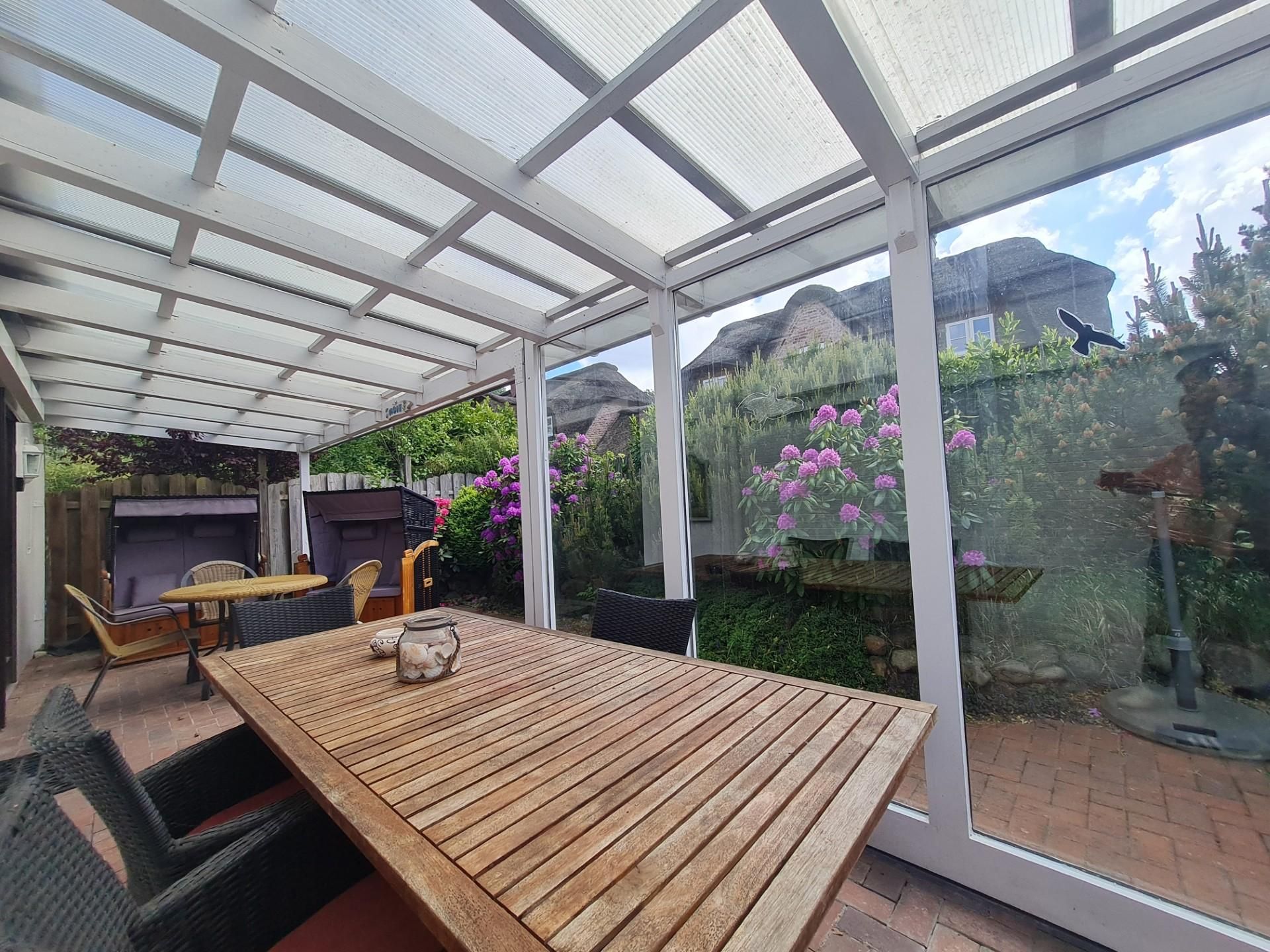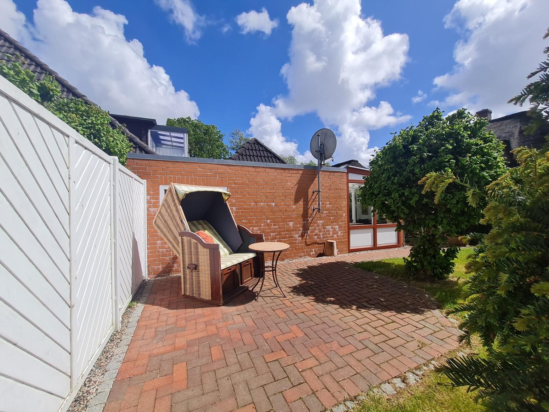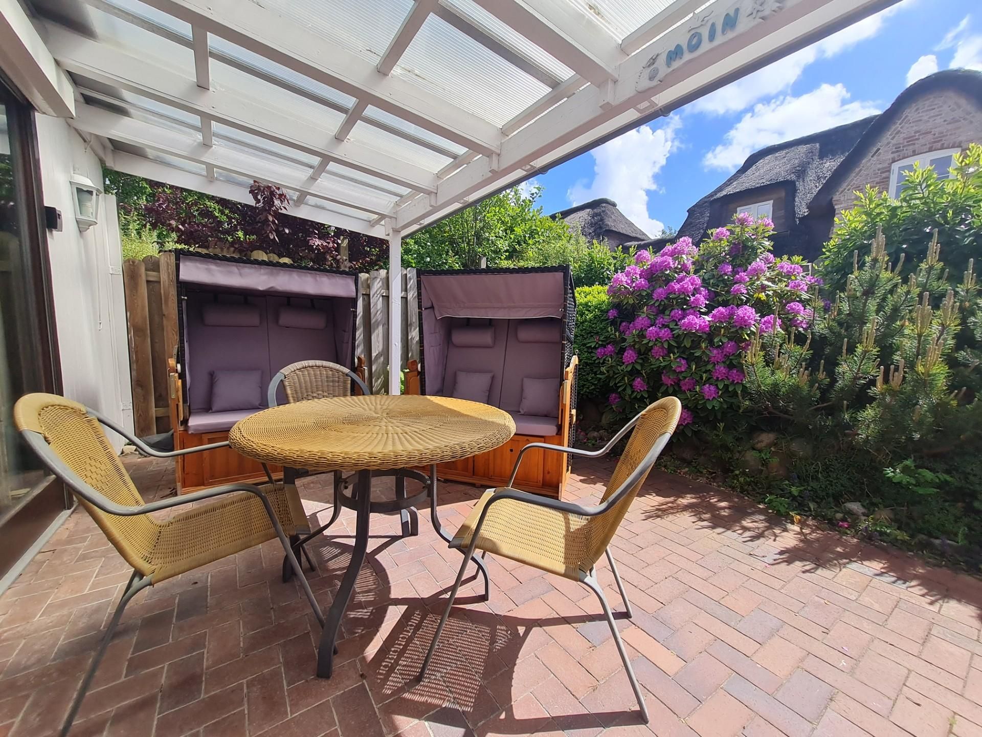 vollmöbliert mit 2 Strandkörben, Tisch, Sesseln.
