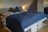 Das im Obergeschoss befindliche geräumige Schlafzimmer ist mit einem großen Doppelbett, hochwertigen Matratzen (Emma), großem Kleiderschrank und einem Kleinkinderbett (Boot) ausgestattet. An jeder Bettseite befindet sich ein Nachttisch mit Beleuchtung. Darüber hinaus gibt es bei Bedarf ein Babyreisebett (0+) zur kostenfreien Nutzung. Das Doppelbett ist bei Anreise bezogen, auf Wunsch auch gerne das Kleinkinderbett.